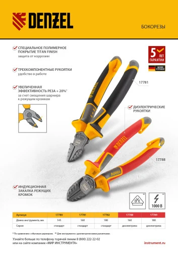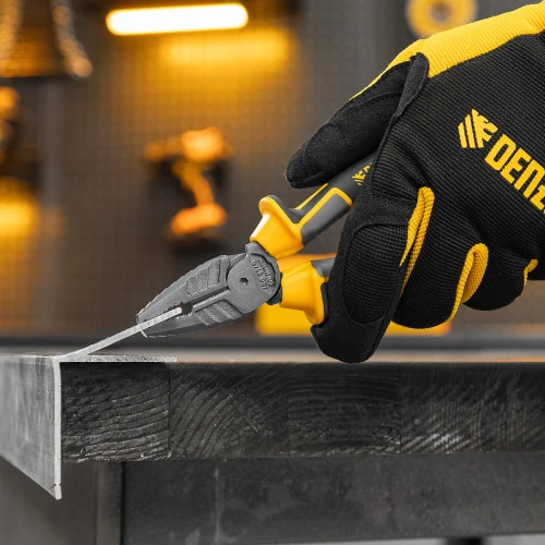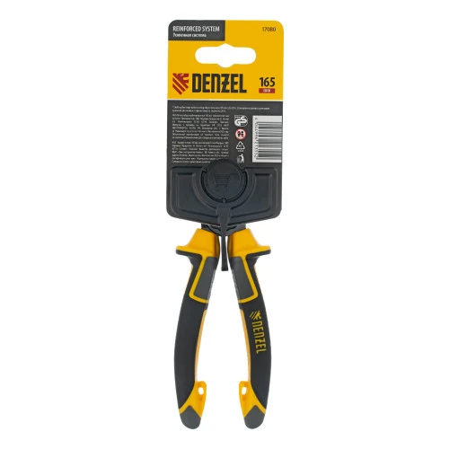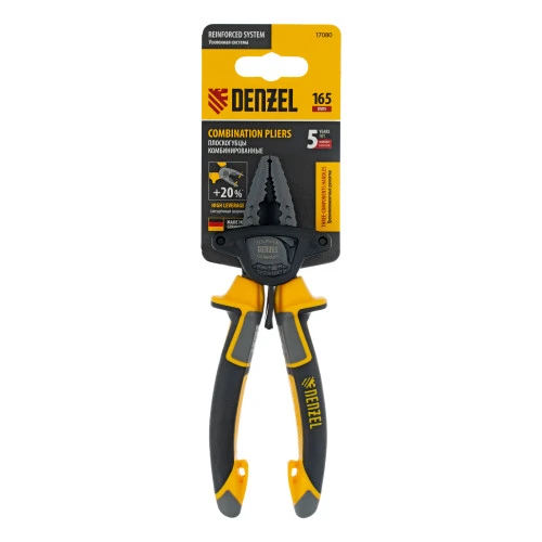 <p>Комбинированные плоскогубцы Denzel 17080 длиной 165 мм, с трехкомпонентными рукоятками, используются для зажима и удержания деталей, сгибания металлических листов. Позволяют также перекусывать мягкую проволоку (алюминиевую, медную, с пределом прочности 220 Н/мм2) диаметром до 4 мм, проволоку средней жесткости и гвозди (750 Н/мм2) диаметром до 3,1 мм, а также жесткую (1800 Н/мм2) толщиной до 2 мм. Имеют внутренние грани специальной формы, предназначенные для использования инструмента в качестве гаечного ключа. Губки с насечками надежно удерживают заготовки. Плоскогубцы пригодятся профессионалу и частному мастеру при проведении слесарных, ремонтных и сборочных работ.</p><h2>Преимущества</h2><ul><li>Эффективность — благодаря смещенному к режущим кромкам шарниру усилие реза увеличено на 20%.</li><li>Высокий ресурс — рабочая часть изготовлена из инструментальной стали C45, режущие кромки прошли закалку индукционными токами до твердости 53 HRC и долго сохраняют рабочие свойства.</li><li>Защита от разрушения — специальное полимерное покрытие Titan finish предотвращает образование коррозии.</li><li>Комфортное использование — эргономичные рукоятки с резиновыми вставками удобно ложатся в руку, что позволяет долго работать без ощущения усталости.</li><li>Дополнительные возможности — на упоры в нижней части рукояток можно установить скобу для подвешивания плоскогубцев или пружину авторазжима.</li><li>Удобная упаковка — плоскогубцы поставляются с подвесной картой для размещения на стенде.</li><li>Гарантия 5 лет — надежность инструмента подтверждена производителем.</li></ul>