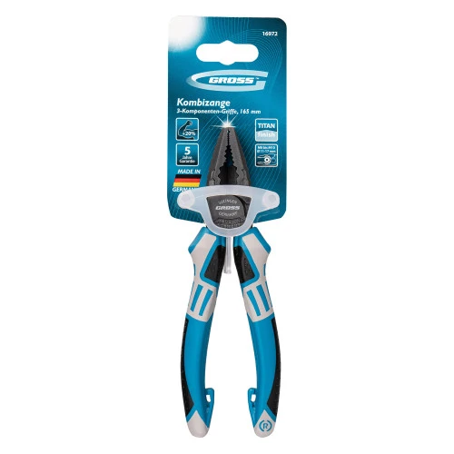 <p>Комбинированные плоскогубцы Gross 16972 длиной 165 мм, с трехкомпонентными рукоятками, используются для перекусывания мягкой и жесткой проволоки, сгибания металлических листов и захвата деталей. Благодаря специальным внутренним граням возможно применение инструмента в качестве гаечного ключа. Плоскогубцы пригодятся профессионалам и частным мастерам для проведения слесарных, строительных и монтажных работ.</p><h2>Преимущества</h2><ul><li>Эффективность — благодаря смещенному к режущим кромкам шарниру усилие реза повышено на 20%.</li><li>Высокий показатель прочности — рабочая часть изготовлена из инструментальной стали 45 методом ковки, а на внешних металлических частях имеются ребра жесткости.</li><li>Защита от коррозии — покрытие Titan finish продлевает срок службы плоскогубцев.</li><li>Долговечность — режущие кромки прошли закалку индукционными токами для повышения твердости и износостойкости.</li><li>Комфортное использование — эргономичные рукоятки с резиновыми вставками удобно лежат в руке, что снижает усталость во время длительной работы.</li><li>Дополнительные возможности — на нижней части рукояток имеются специальные упоры, на которые можно установить скобу для подвешивания или пружину авторазжима.</li><li>Подтвержденное качество — производитель предоставляет 5-летнюю гарантию на заводской брак.</li></ul>