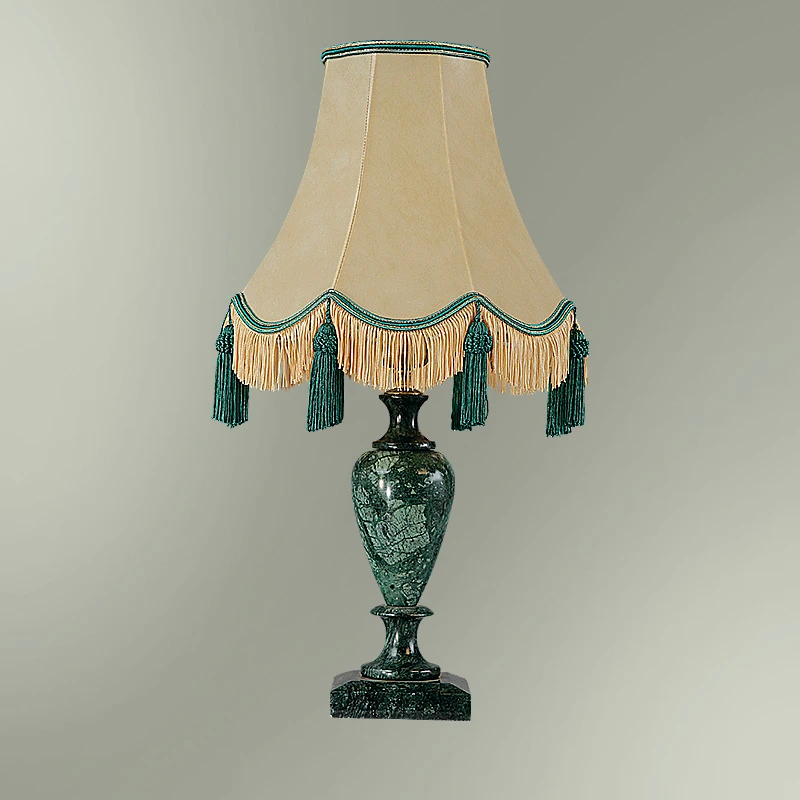 Настольная лампа с элементами из натурального камня найдет себе место как в гостинной, так и в спальне на прикроватной тумбочке. Смягчая контуры обстановки и создавая замечательную игру светотени данная модель станет украшением Вашего дома. Основание лампы изготовлено из мрамора, абажур изготовлен из искусственной кожи, выключатель расположен на шнуре с вилкой.