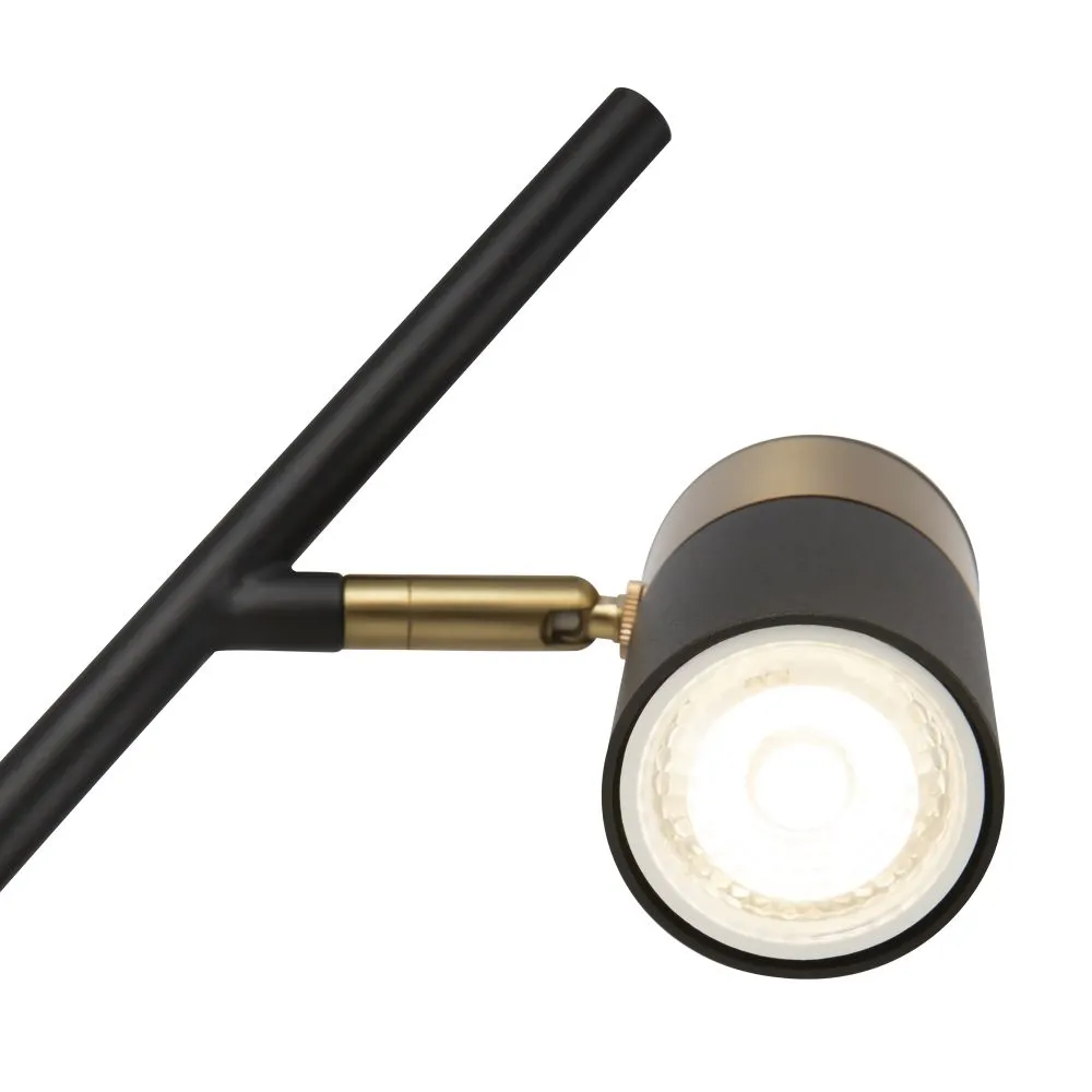 Арматура и плафоны из металла. Черный цвет дополнен латунной окантовкой. Поворотные плафоны и арматура позволяют видоизменять композицию и регулировать направление светового потока. Источник света – лампа GU10.