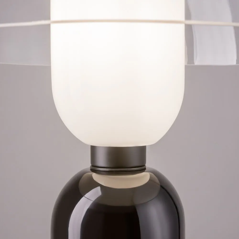 Металлическая арматура, цвет - черный. Светильники стилизованы под форму песочных часов с обтекаемой формой. Керамические элементы с глянцеовй глазурью. Подвесные светильники с плафонами из белой керамики с прозрачным, черно-белым, золото-белым и белым стеклом. Регулируемая высота подвесных светильников.