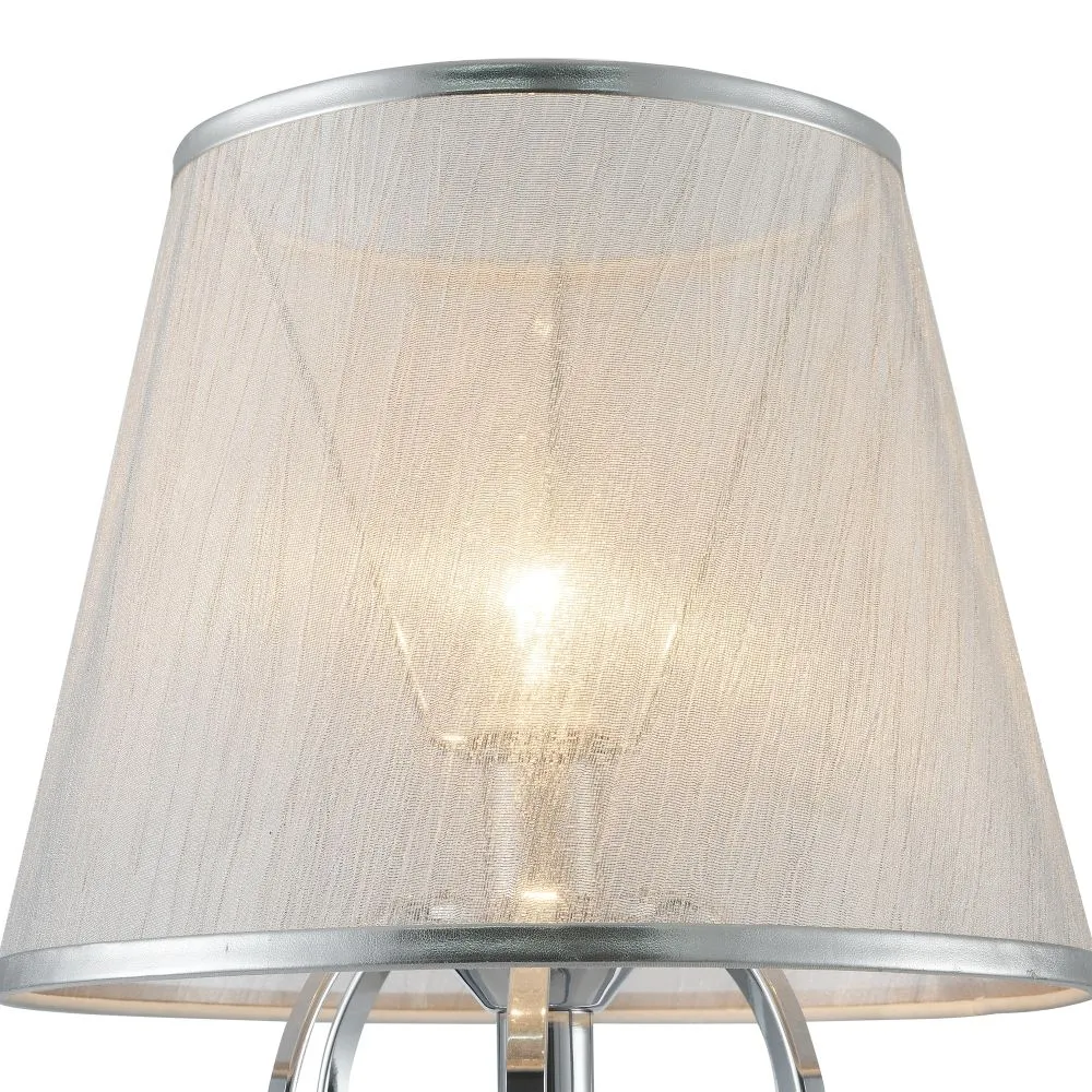 Абажуры и арматура светильников выполнены в разных цветах, с несколькими видами арматуры. Основание люстры украшено стеклянным декоративным элементом, а завитки рожков украшают подвески.