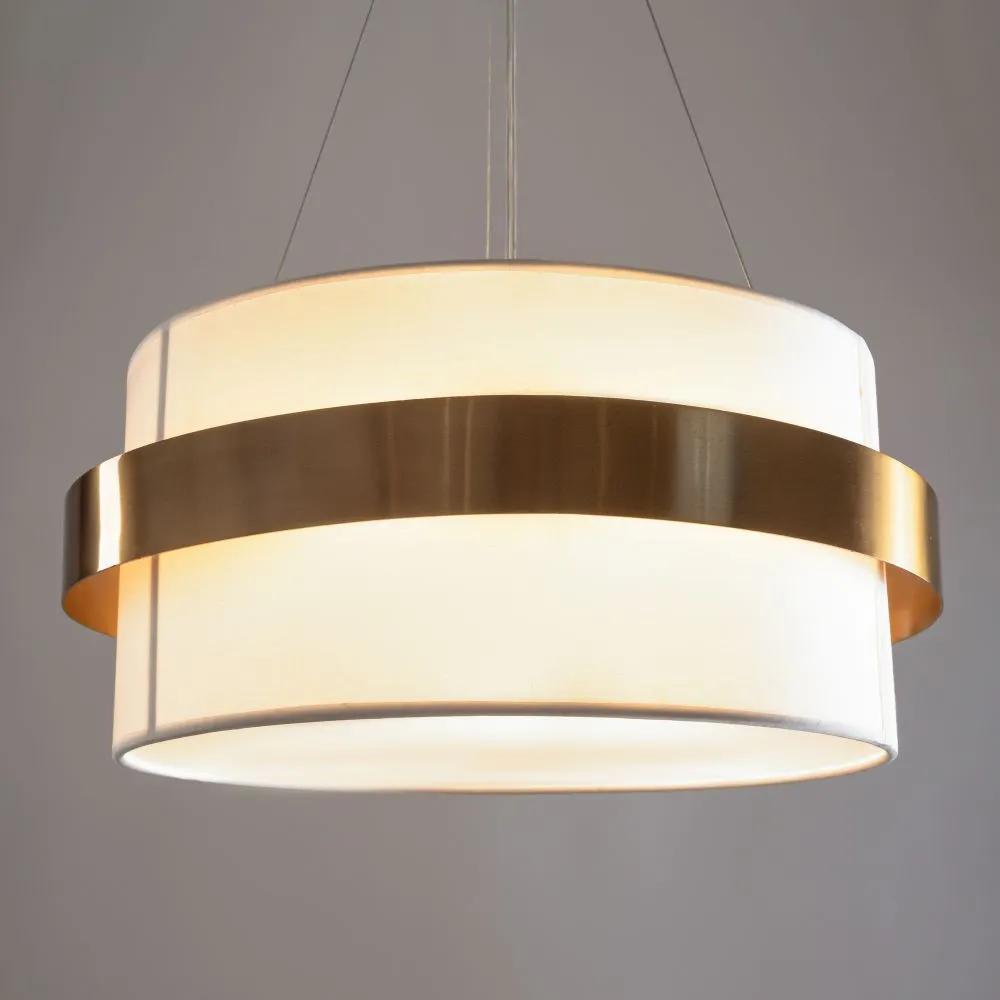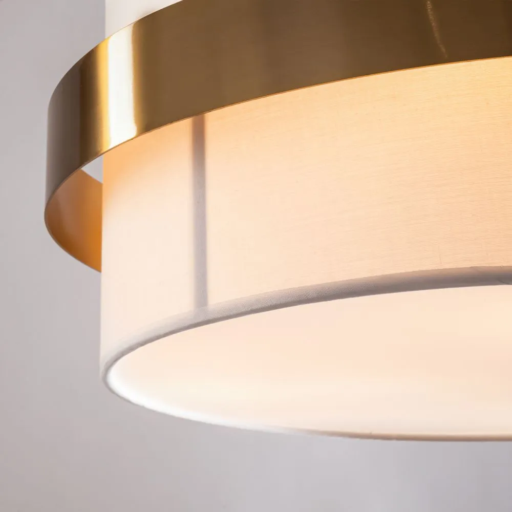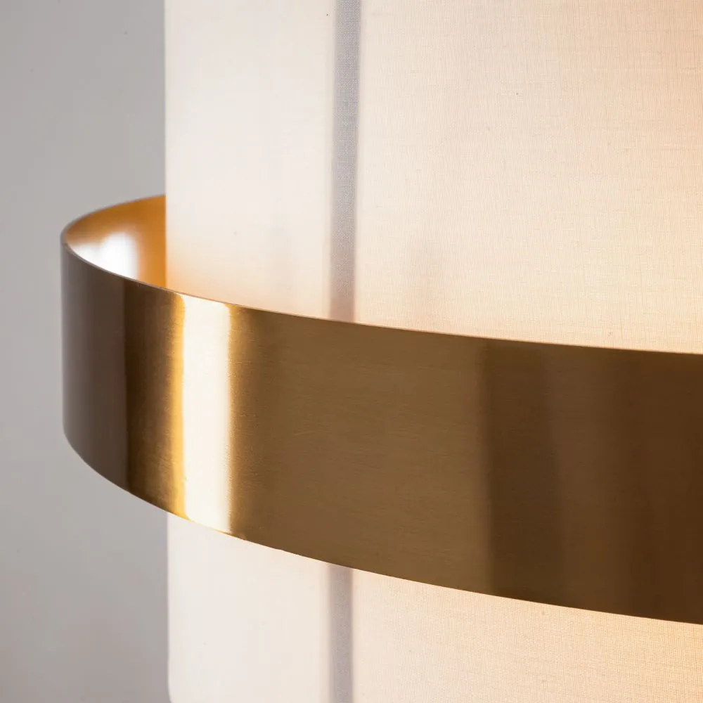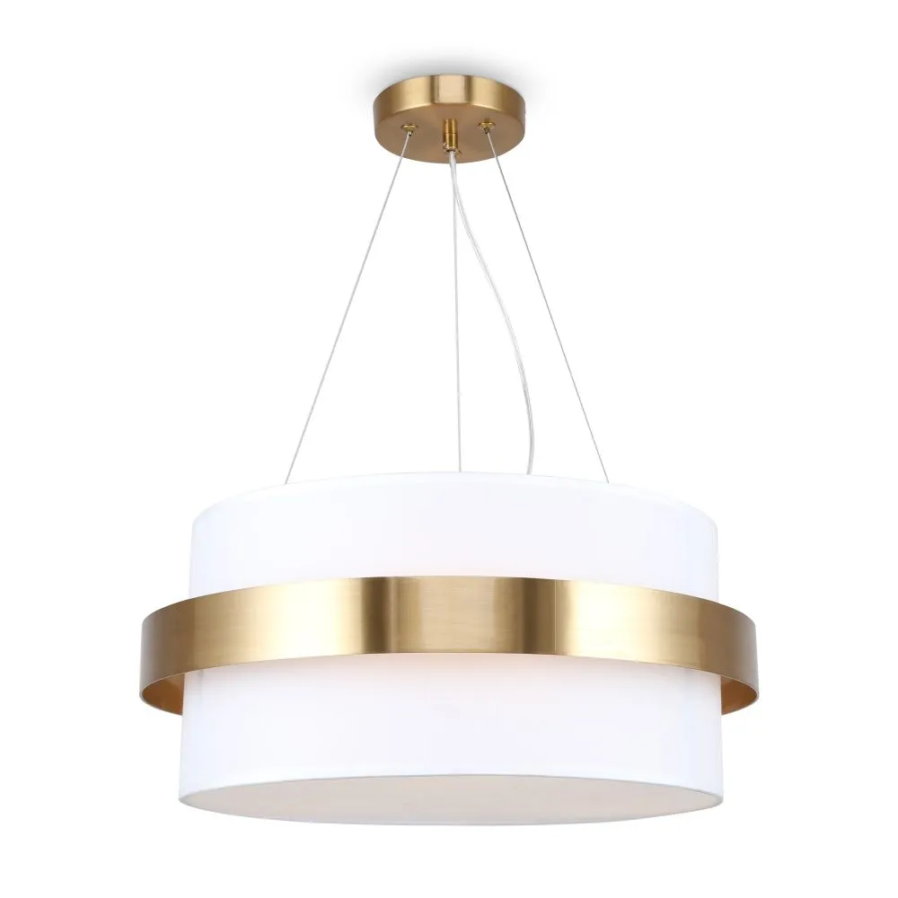 Цилиндрической формы абажур из ткани белого цвета. Декоративная парящая окантовка из металла в цвет арматуры. Регулируется по длине. Компактные размеры подходят для низких потолков и небольших интерьеров. Металлическая арматура, цвет - латунь и никель. Источник света — лампа с цоколем Е14, E27 и для настенного бра дополнительный LED с температурой свечения 3000 K.