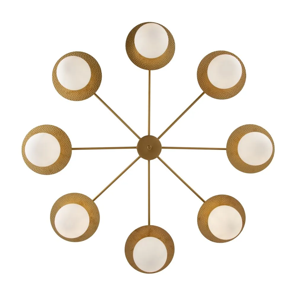 Арматура из металла, цвет – латунь. Плафоны сферической формы из матового белого стекла. Плоские розетки с эффектом чеканки. Трендовый микс фактур. Источник света – лампа с цоколем Е27.