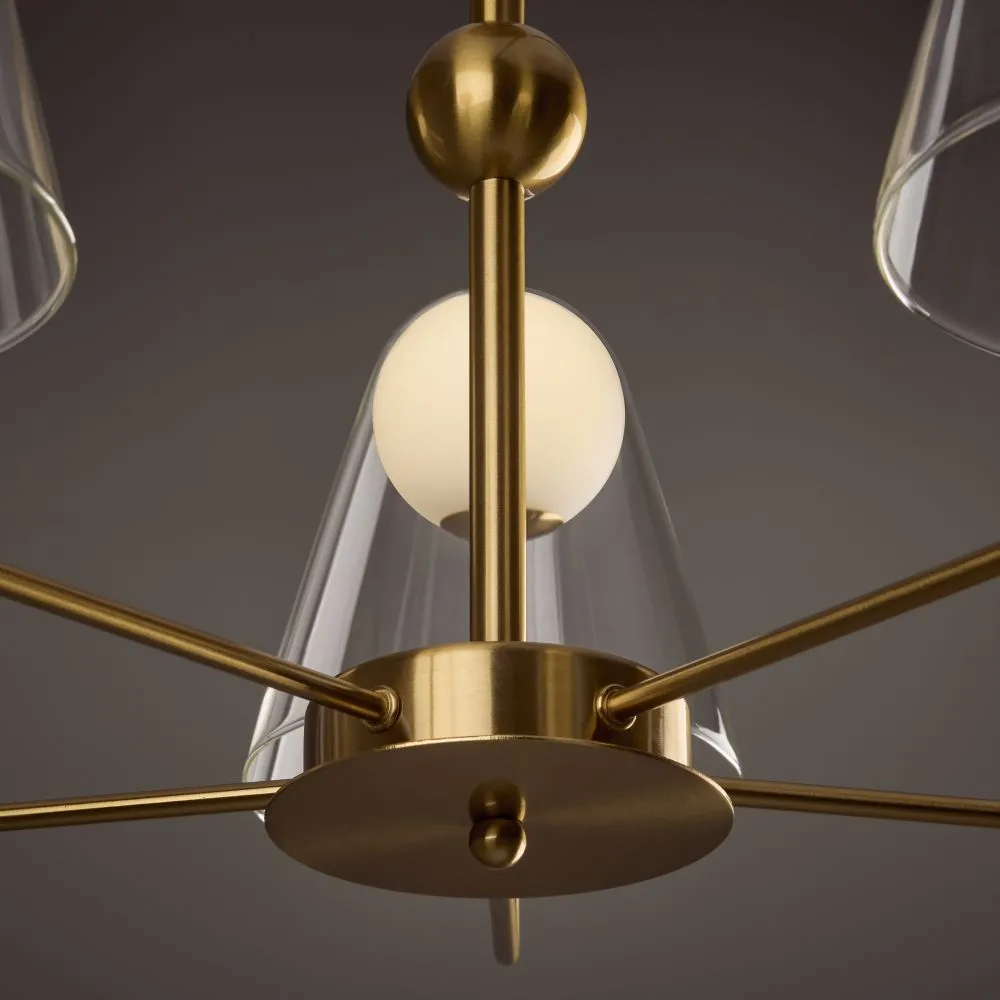 Арматура — металл, цвет — латунь. Двойные плафоны из стекла. Внешний — прозрачный в форме конуса плавно обрамляет контуры внутреннего матового сферического плафона. Свежий взгляд в дизайне на комбинацию форм и фактур. Источником света служит лампа с цоколем G9.