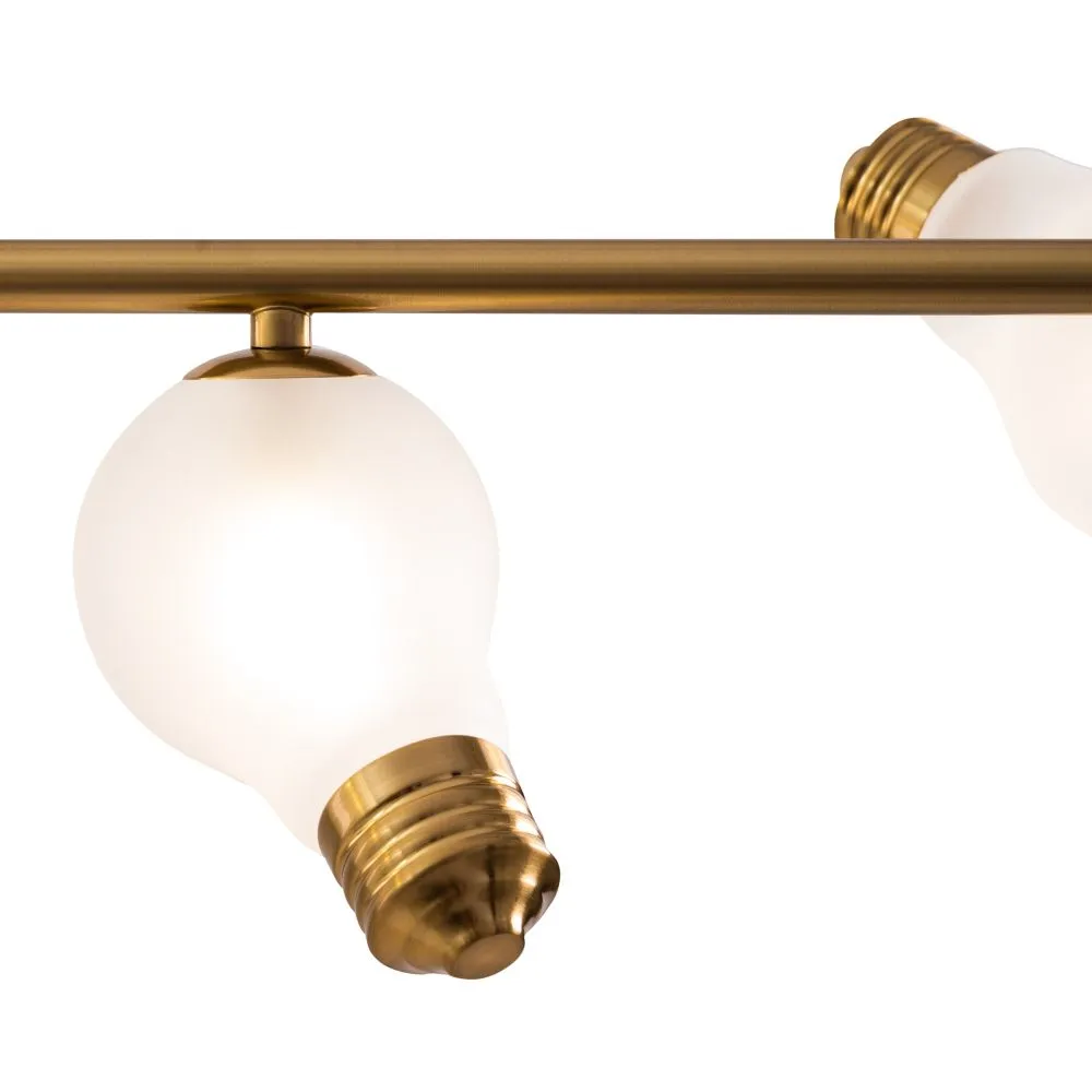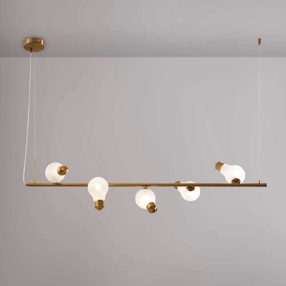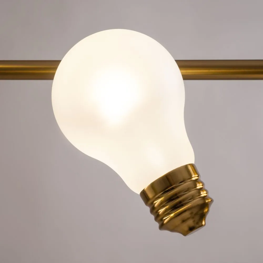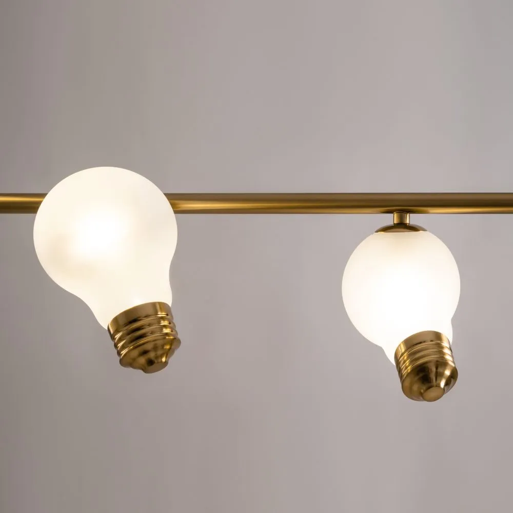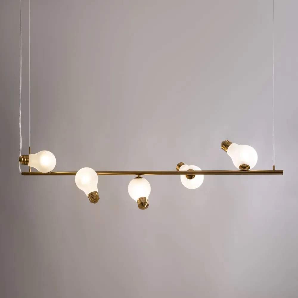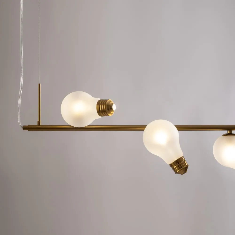 Металлическая арматура, цвета — чёрный и латунь. Прозрачные плафоны-лампочки из стекла в тон арматуры хаотично “разбросаны” по острову светильника. Подвесы регулируются по высоте. Источник света — лампа с цоколем G9.