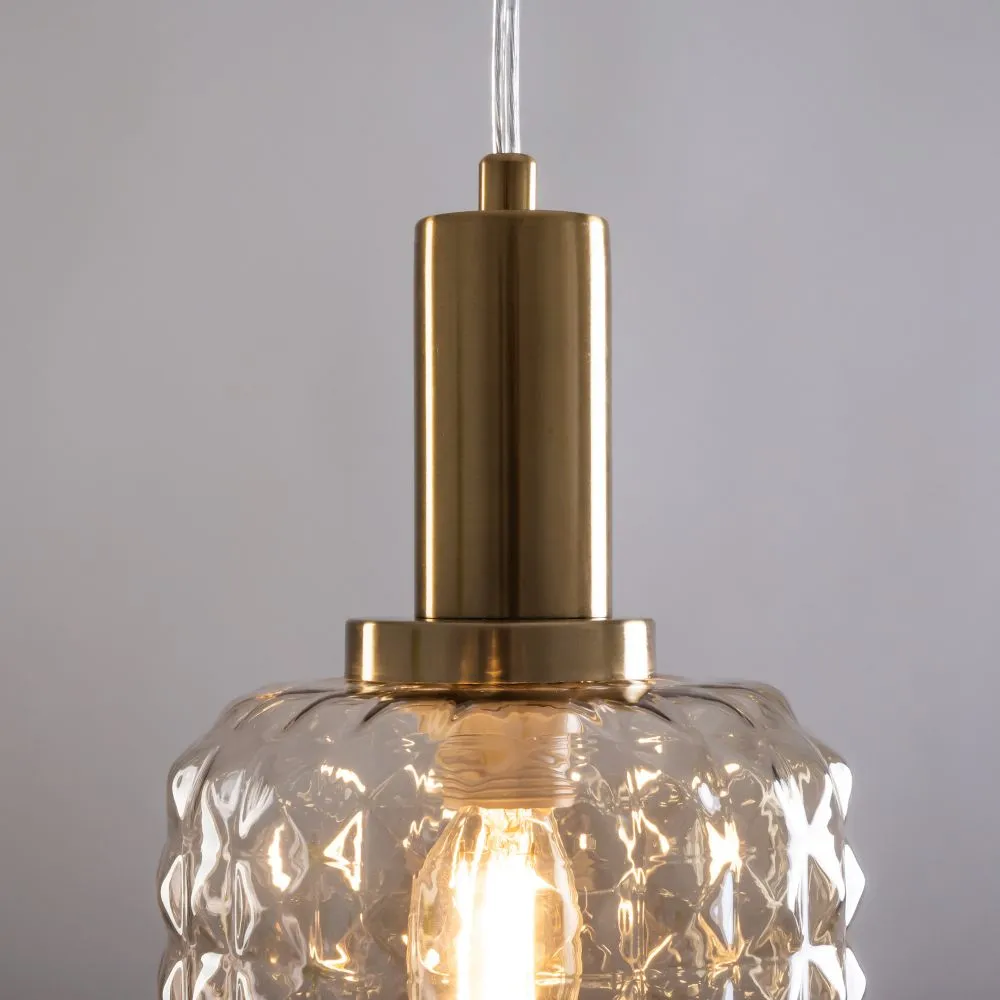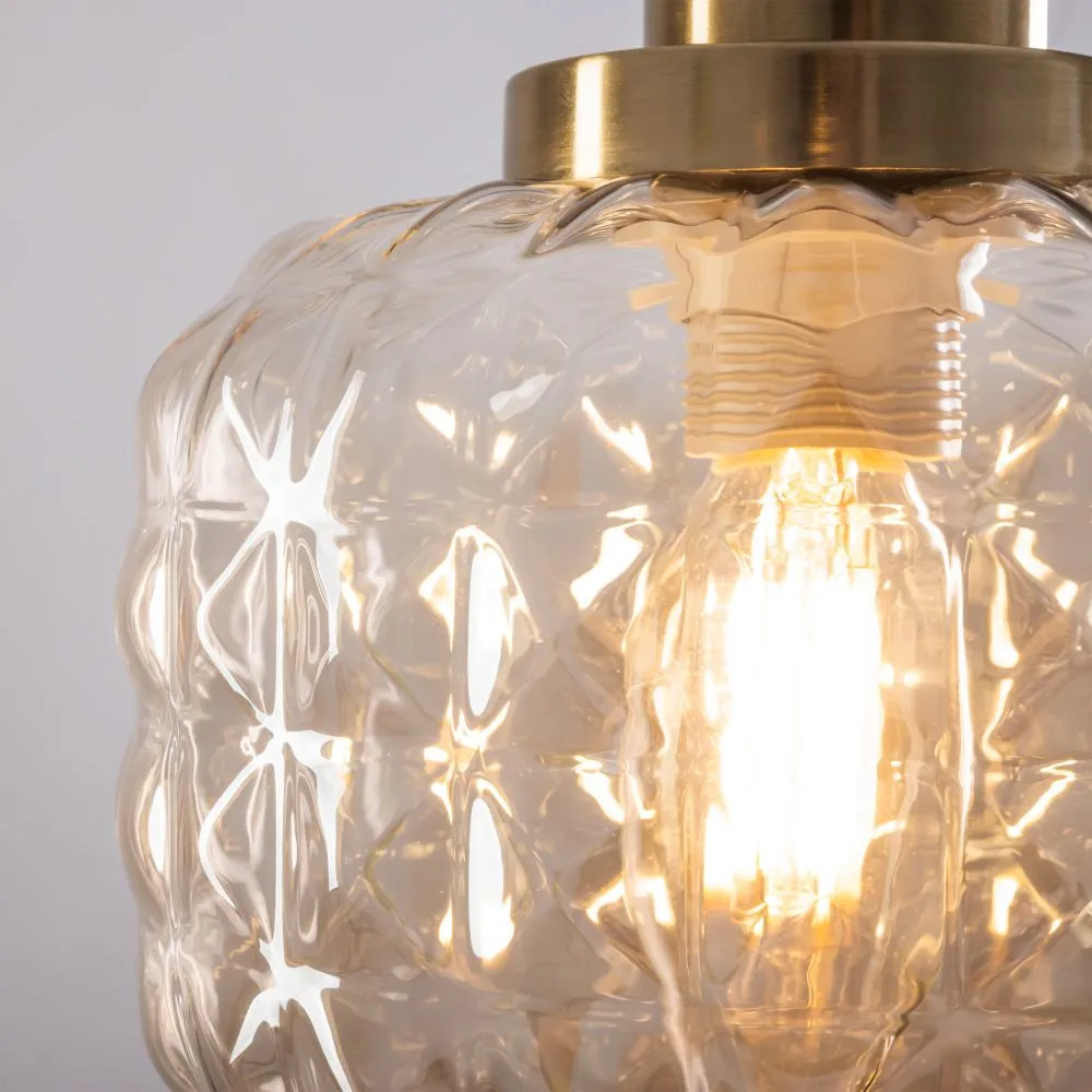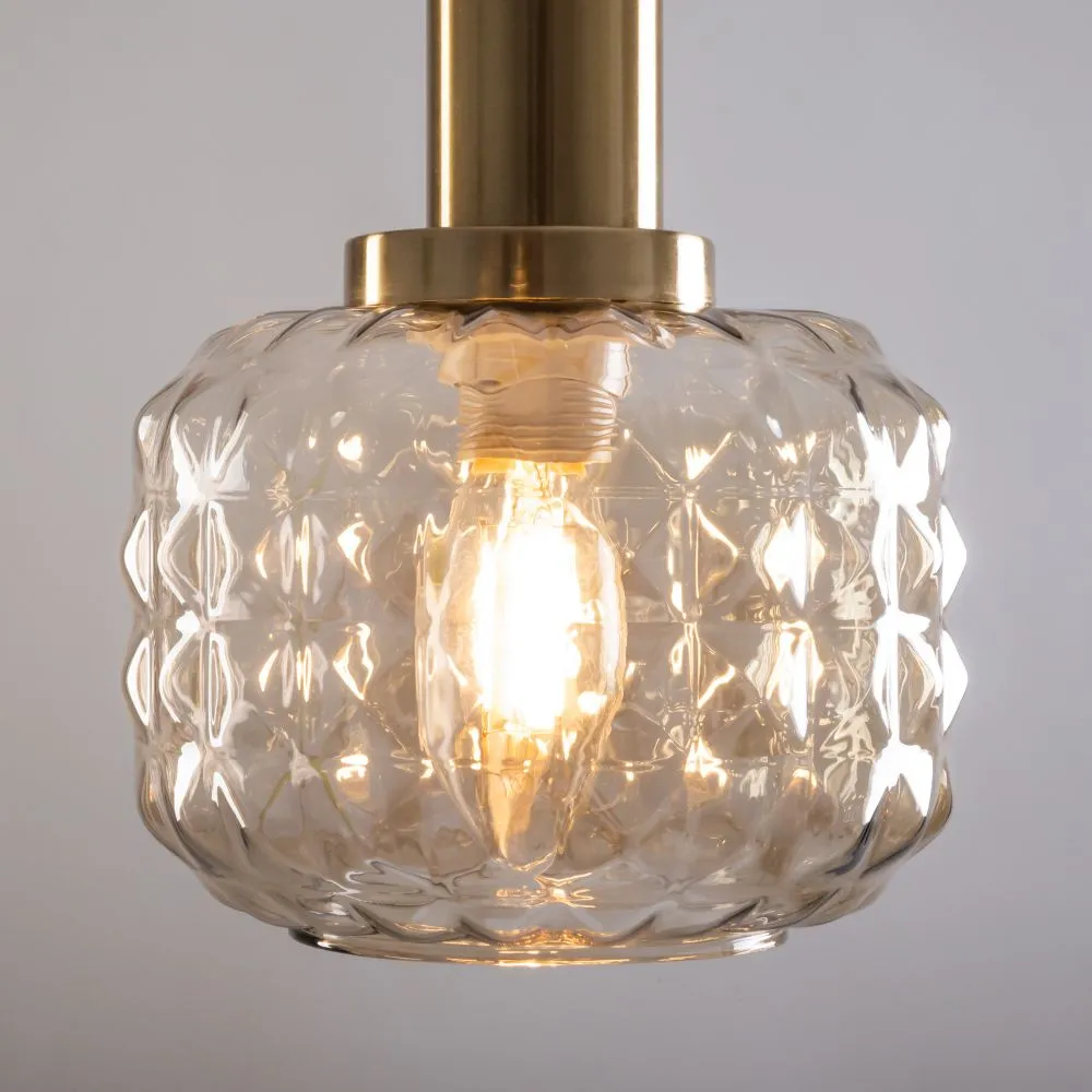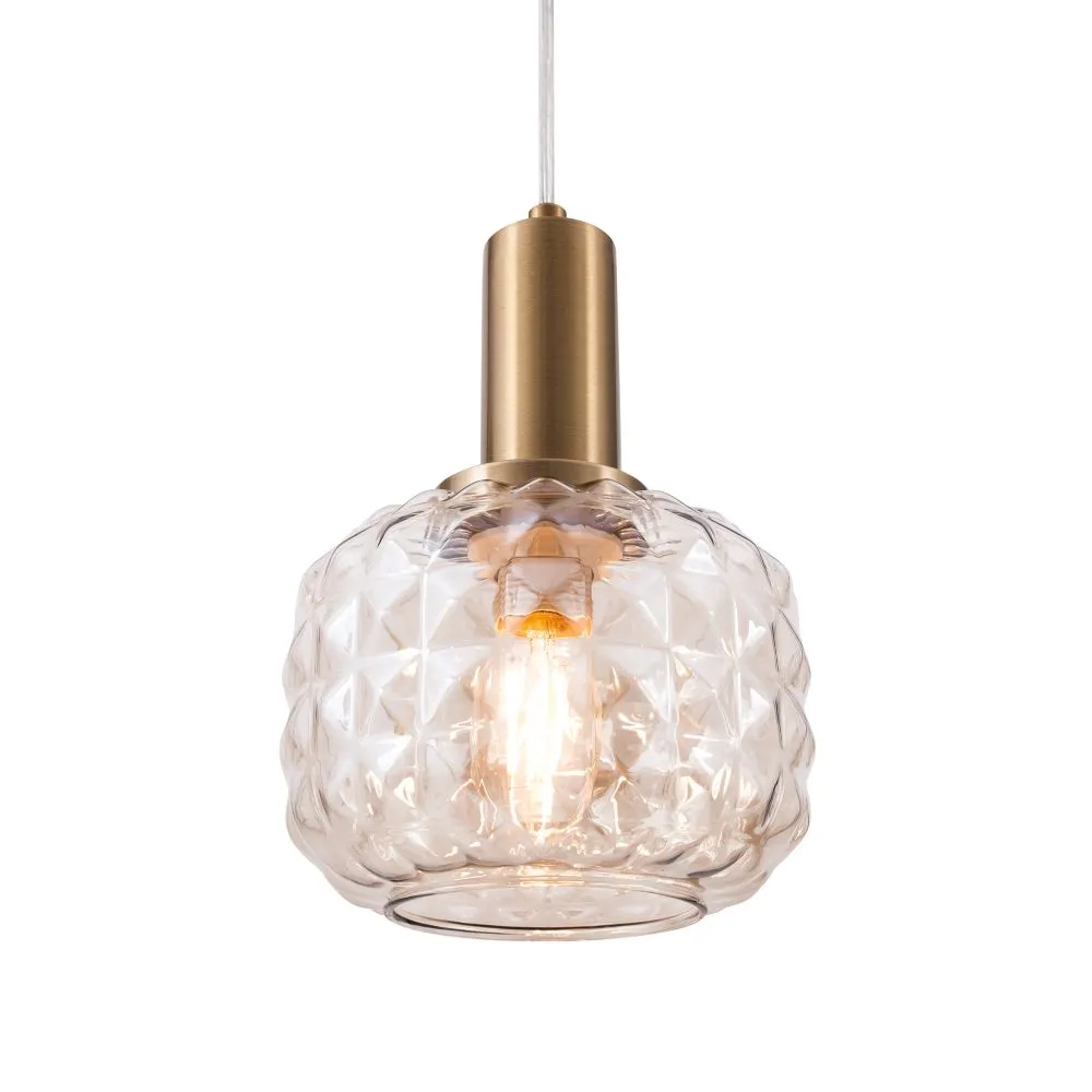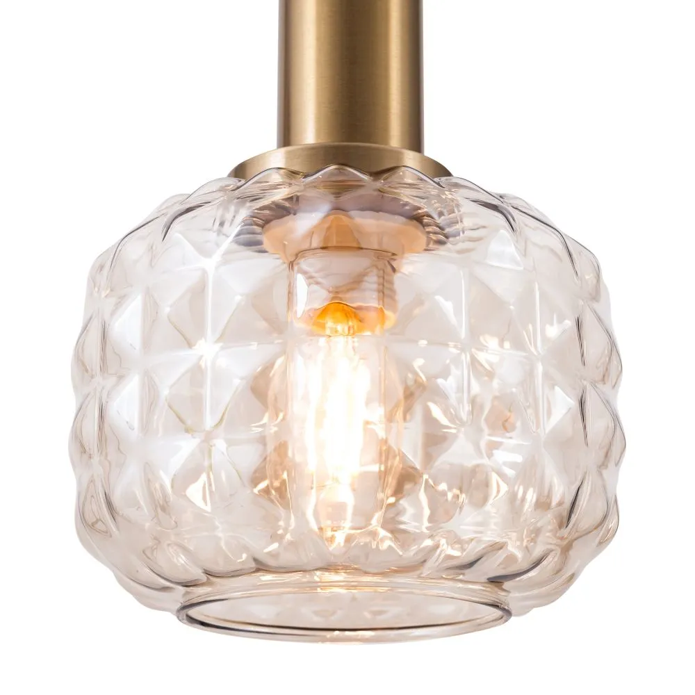 Металлическая арматура в цвете латунь. Плафоны из толстого рельефного стекла в оттенке амбра с «шипованной» огранкой. Подвесные модели регулируется по высоте. Источник света - лампа с цоколем Е14