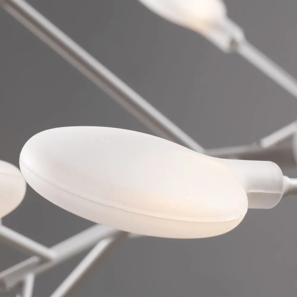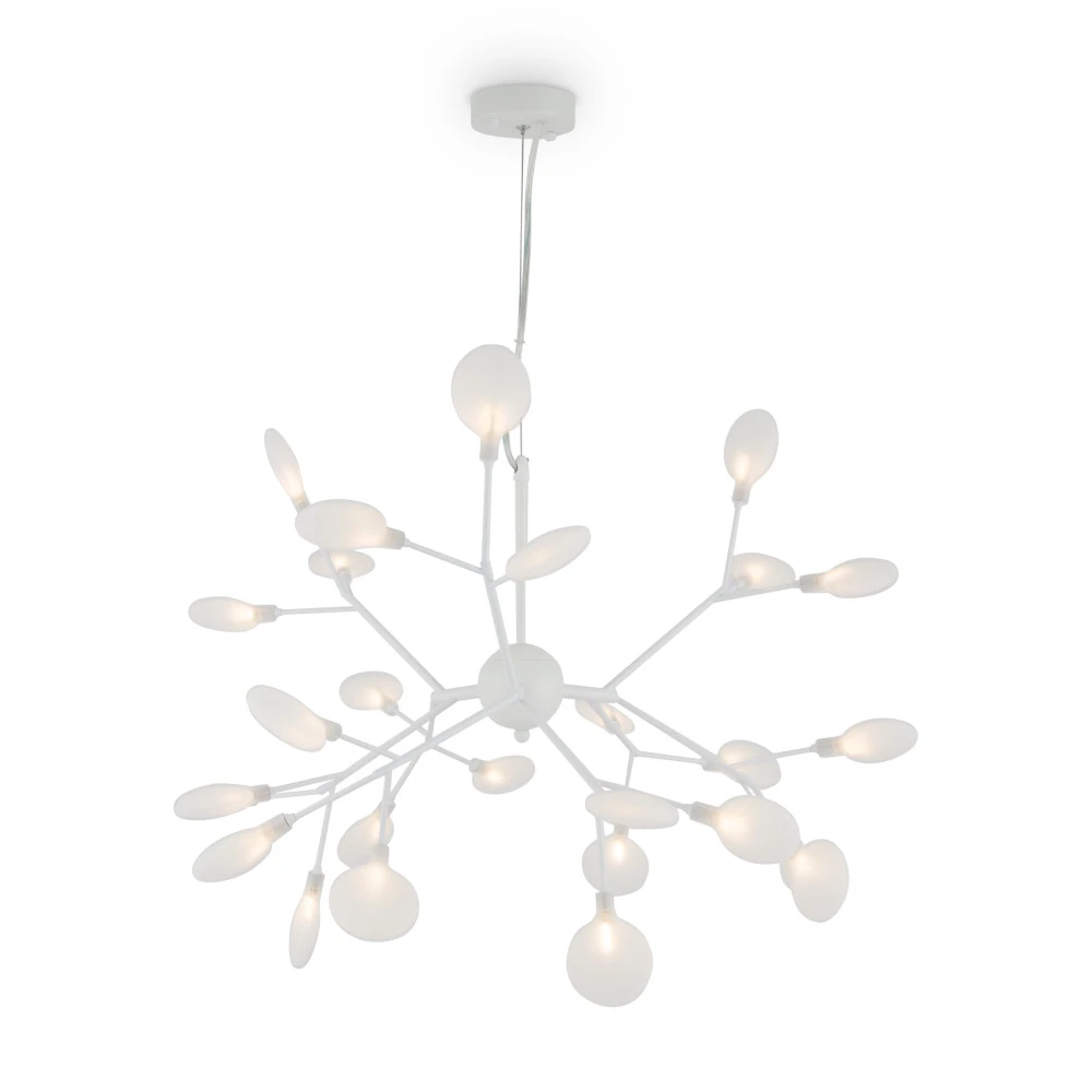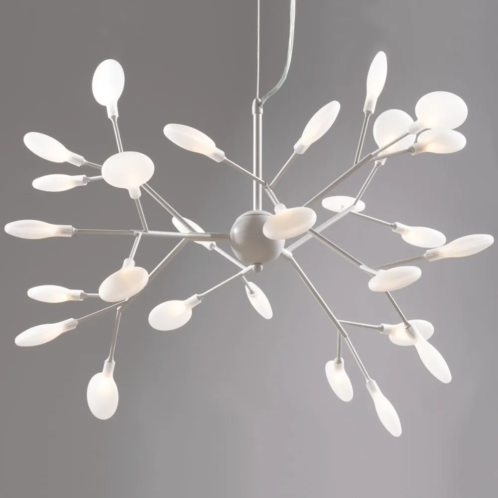 Материал арматуры – металл. Оттенки – черный, белый. Стеклянные плафоны оригинальной формы. Трендовый флористический дизайн. Источник света – лампа G4.