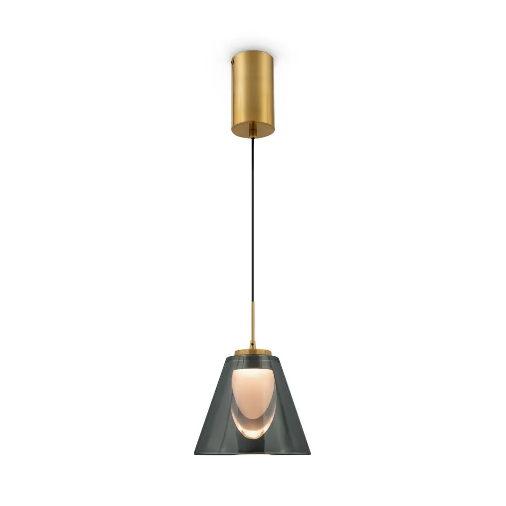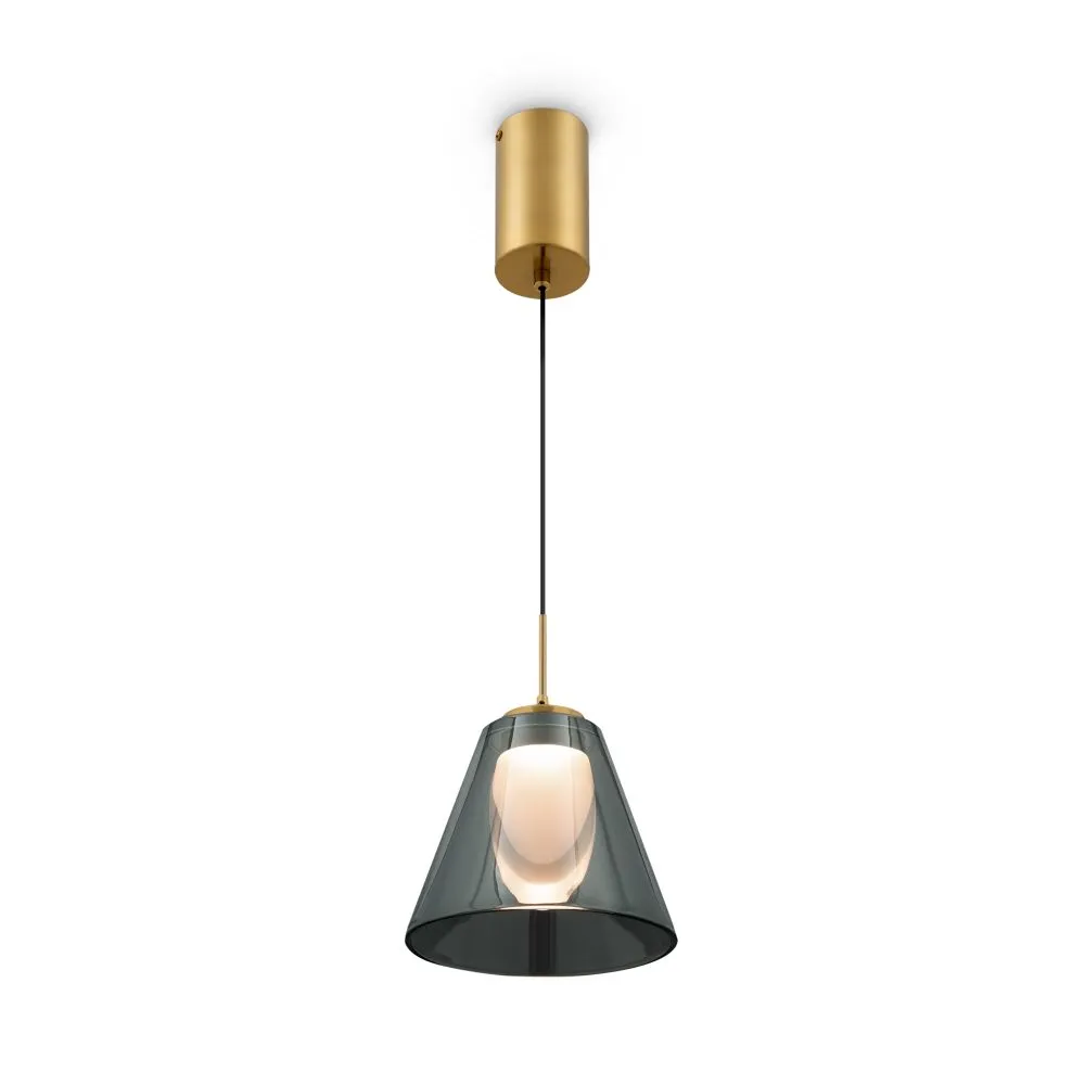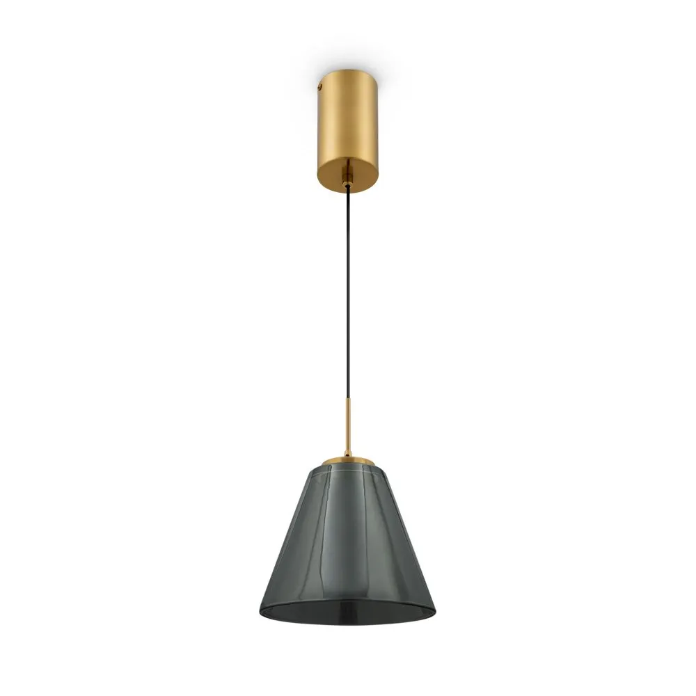 Арматура — металл, цвет — латунь. Плафоны из прозрачного стекла с дымчатым оттенком в форме овала, круга или конуса. Универсальный минималистичный дизайн позволяет составлять комбинации из нескольких подвесов. Регулируемая высота. Тренд «invisible light» - LED-источник света утоплен в основание плафона. Цветовая температура - 3000К.