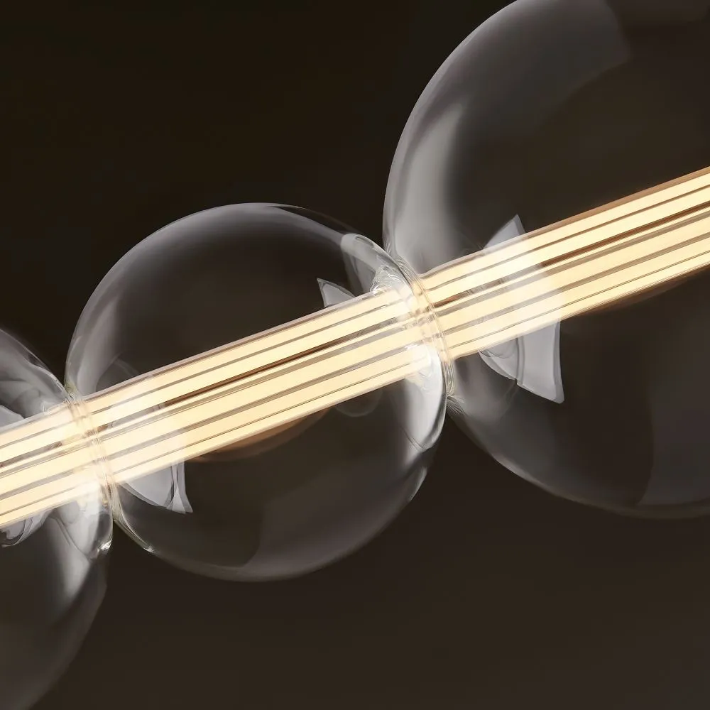 Арматура — металл, цвет — латунь. Тренд «invisible light» - LED-источник света скрыт в горизонтальной стеклянной трубке, пронизывая ряд декоративных плафонов-шаров разного размера из прозрачного стекла. Воздушная минималистичная горизонтальная конструкция. Регулируемая высота. Цветовая температура - 3000К.