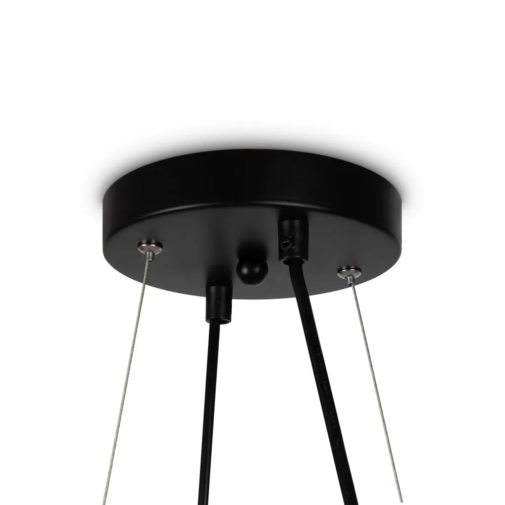 Металлическая арматура, цвета - черный и золотой. Плафоны-сферы из стекла 2х оттенков - матовый белый, полупрозрачный дымчатый - расположены на вытянутом металлическом каркасе, обеспечивая равномерный свет. Тонкие тросы придают светильнику эффект парения. Источник света - лампа с цоколем G9.