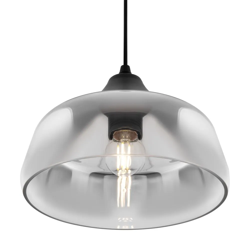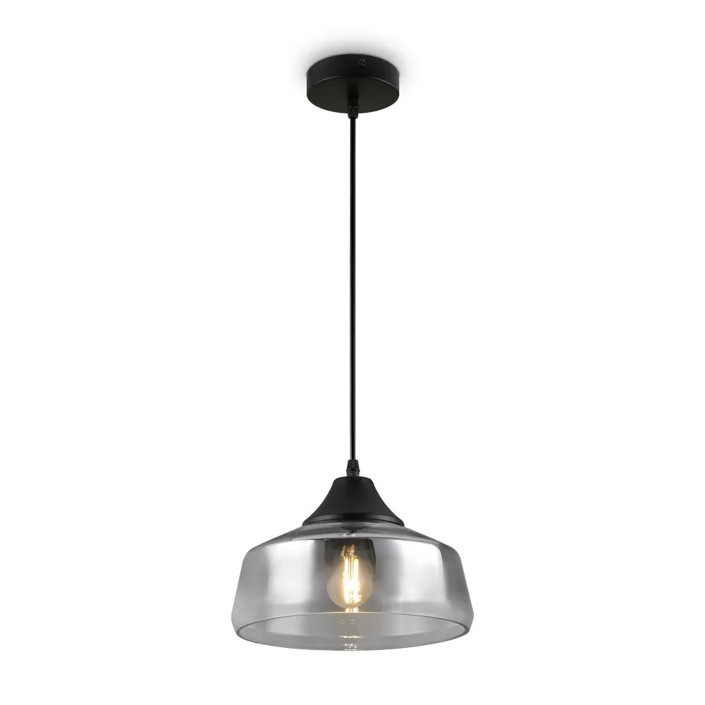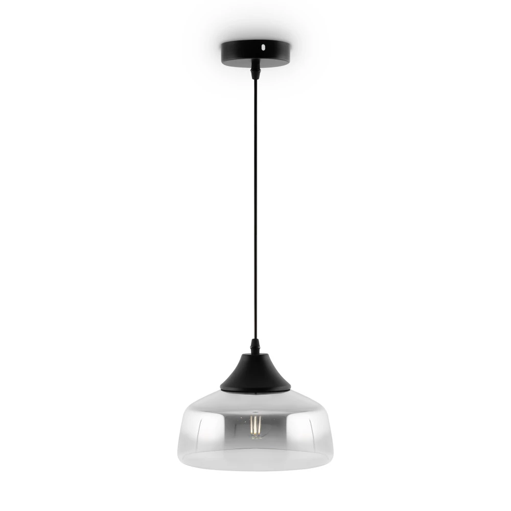 Металлическая арматура в черном цвете. Стеклянный плафон с мягким градиентным переходом оттенков. Цветовые решения – серый, янтарный. Трендовая обтекаемая форма. Источник света – лампа с цоколем E27.