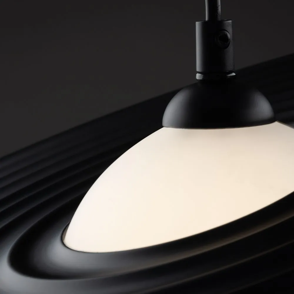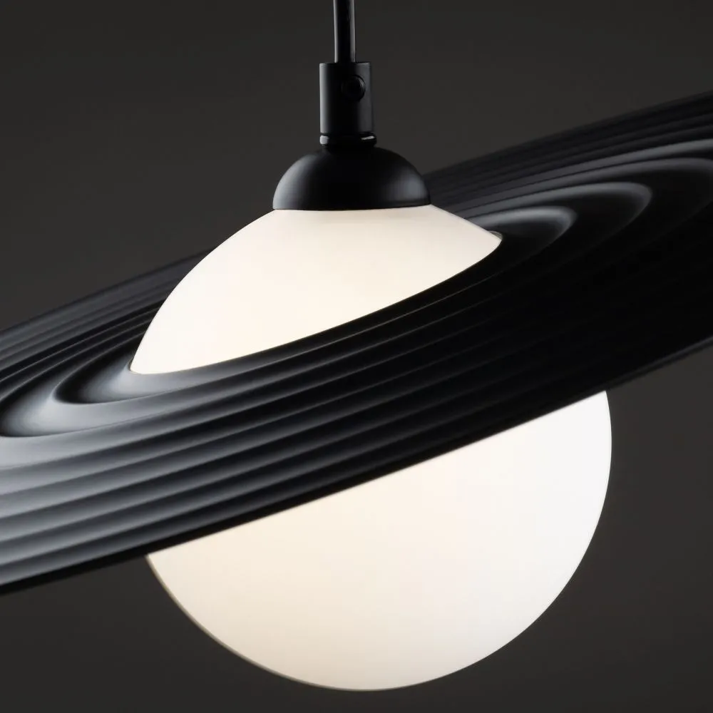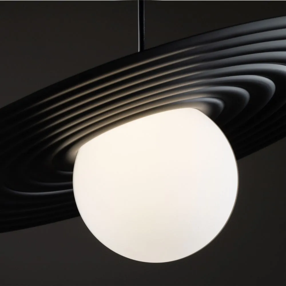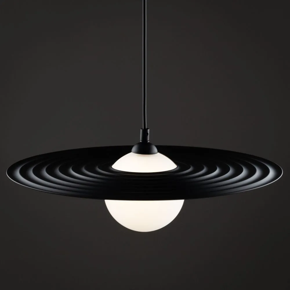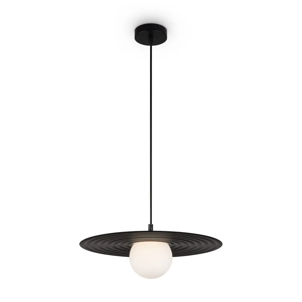 Арматура — металл, цвета — чёрный и белый. Матовый белый плафон с декоративным элементом — металлической тарелкой. Можно регулировать минимальную и максимальную высоту. Лампа с цоколем G9 служит источником света.