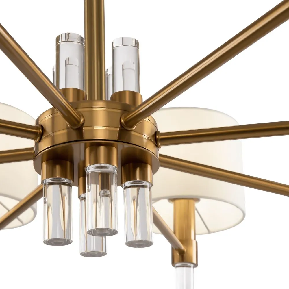 Металлическая арматура. Цвет – латунь. Тканевые абажуры белого оттенка. Декор – прозрачные акриловые трубки. Трендовая комбинация фактур и материалов. Широкий ассортимент. Торшер и подвес с цоколем Е27, лампа, бра и люстры – Е14.