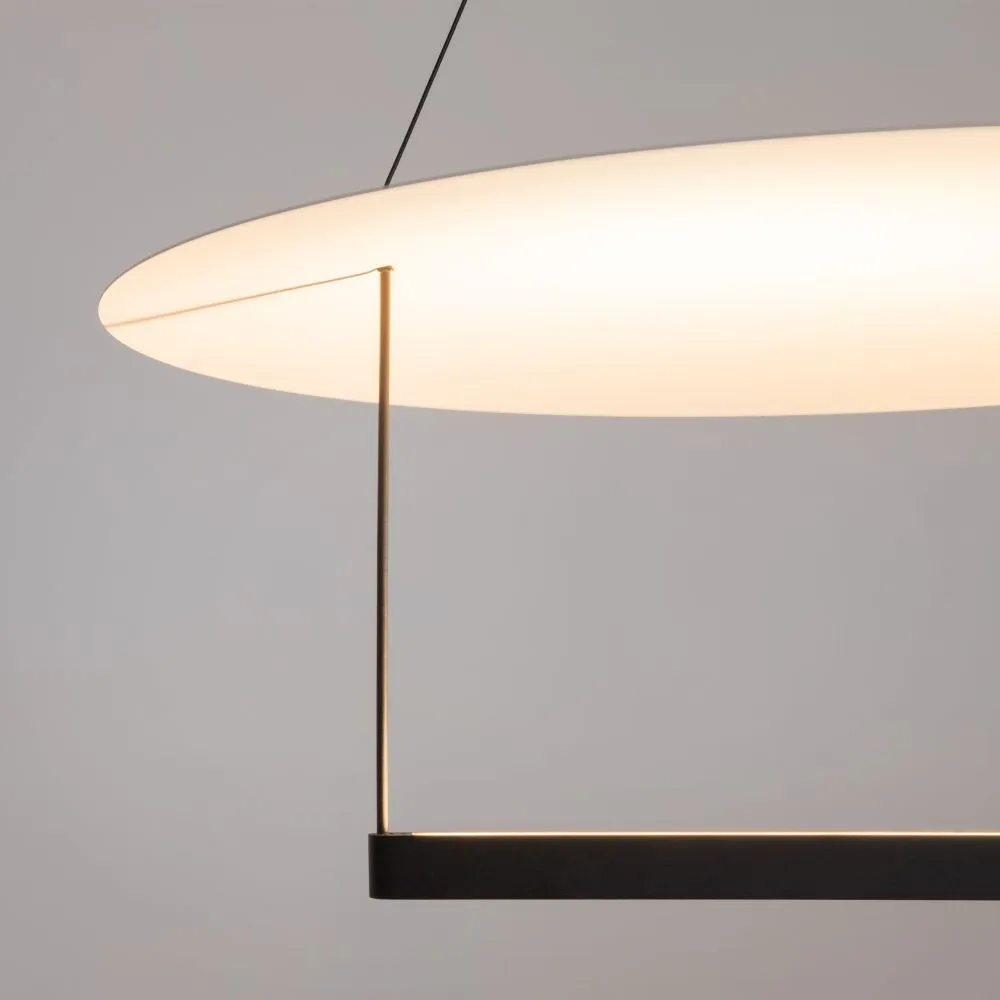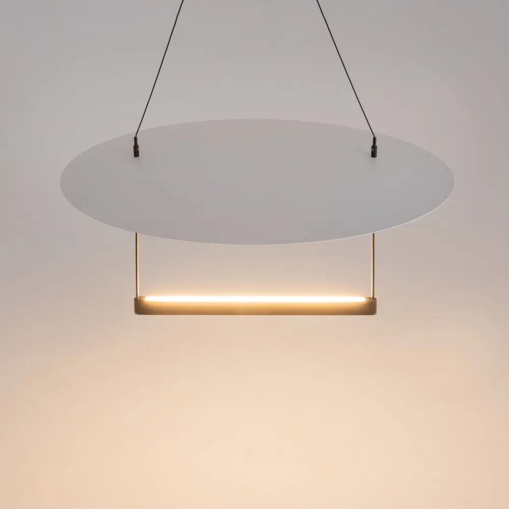 Арматура из алюминия черного цвета, контрастирует белой пластиной диаметром 420мм или 600мм. Силиконовый рассеиватель скрывает LED-источник света с температурой 3000К. В серии представлены светильники двух поколений: в первом источник светит только вверх; во втором источник светит вверх и вниз, что позволяет подсветить рабочую поверхность. Также светильники второго поколения дополнительно имеют функцию диммирования. Высота подвесных светильников регулируется, максимальная длина провода - 3 метра.