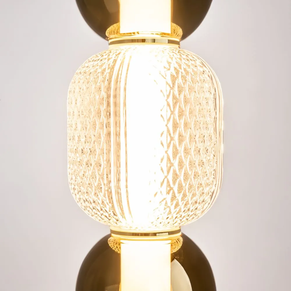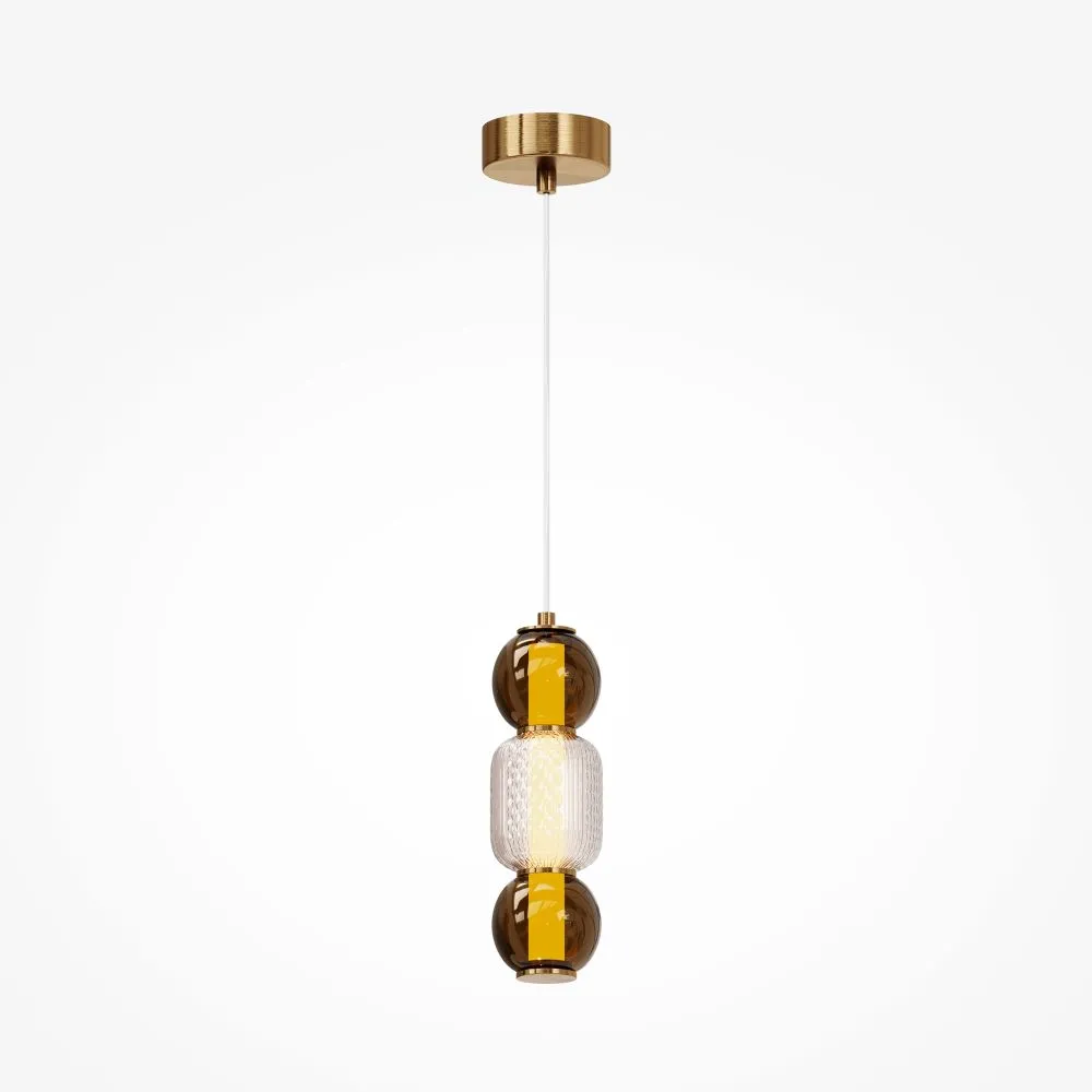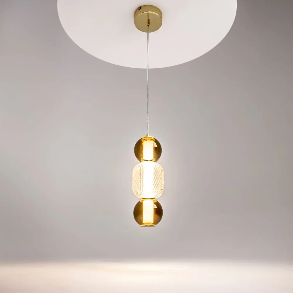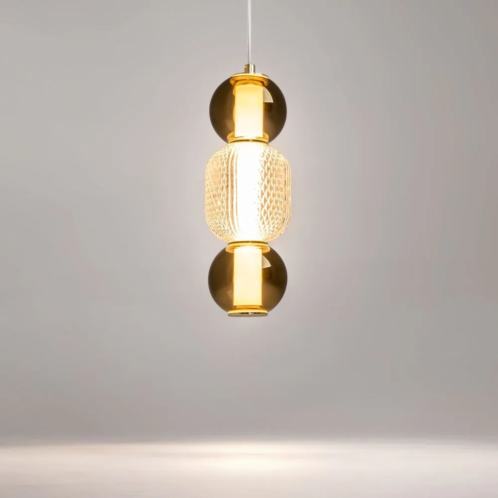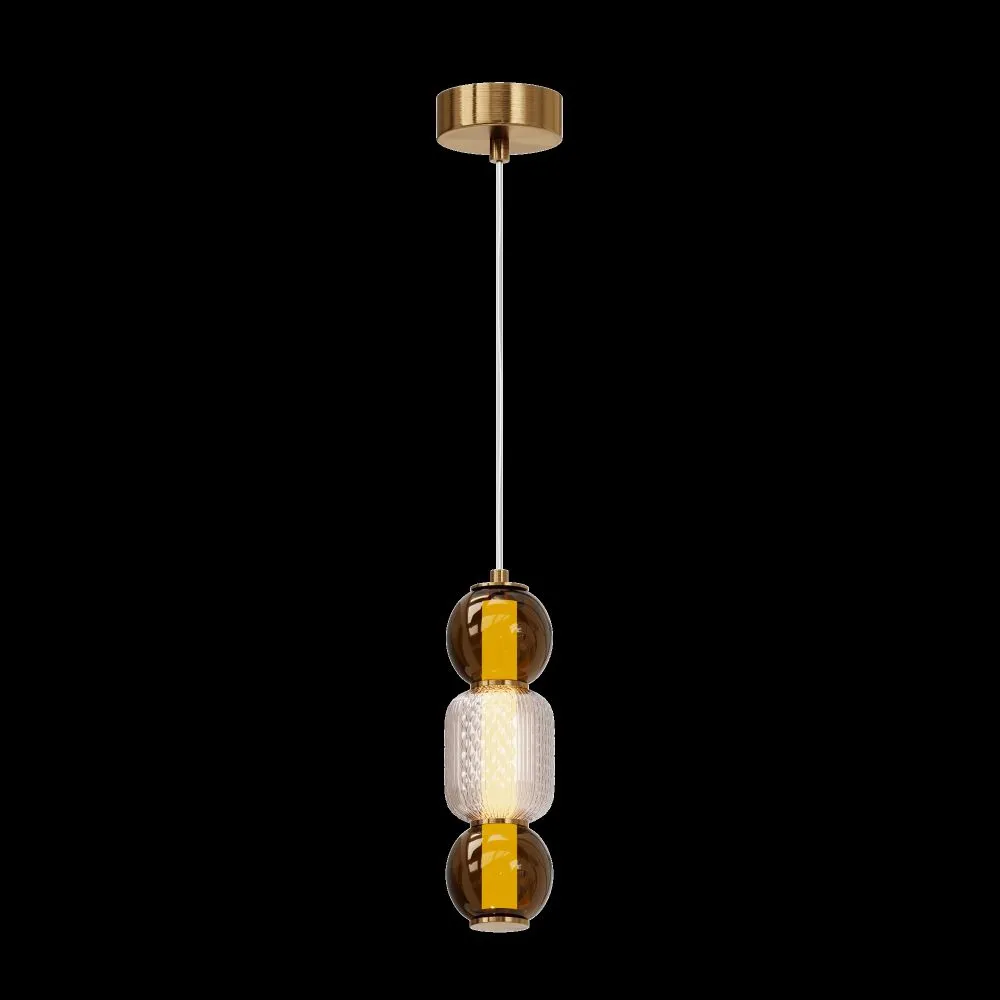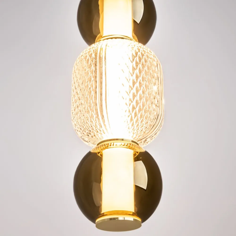 Материал арматуры - металл, цвета - золото, хром. Микс плафонов: гладкие cферы коньячного или дымчатого оттенка + округлые рельефные с ромбовидным узором из прозрачного стекла. Регулируемая высота подвесных моделей - максимальная длина провода 3 метра. LED-источник света, цветовая температура 3000К