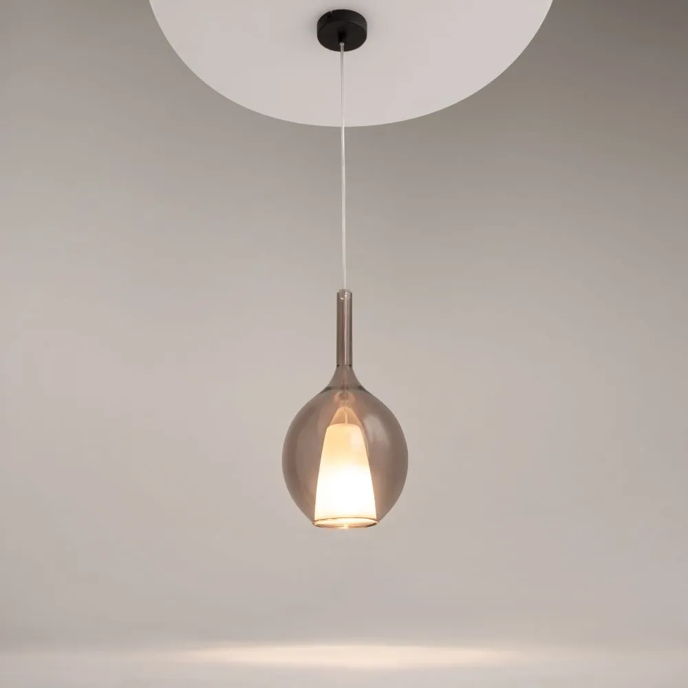 Металлическое основание, цвет — черный. Двойные стеклянные плафоны. Многообразные геометрические формы плафонов. Цвет стекла: зеркальный золотой, кофейный и дымчатый, а также градиентный белый. Регулируемая длина провода — 3 метра. Источник света — лампа с цоколем Е27.