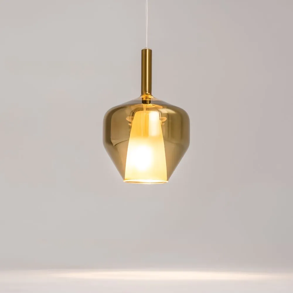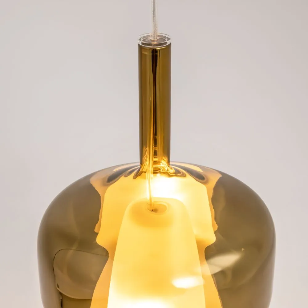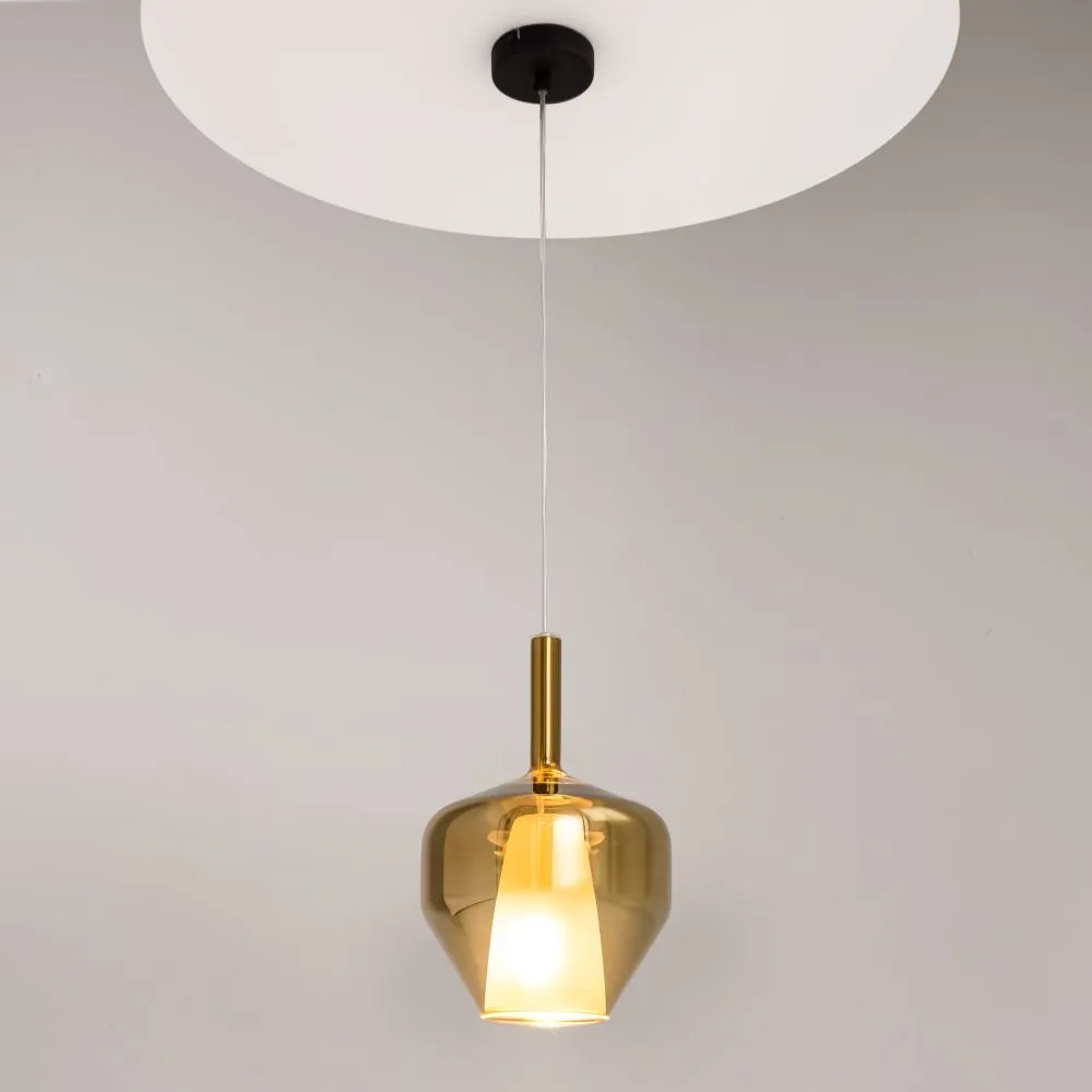 Металлическое основание, цвет — черный. Двойные стеклянные плафоны. Многообразные геометрические формы плафонов. Цвет стекла: зеркальный золотой, кофейный и дымчатый, а также градиентный белый. Регулируемая длина провода — 3 метра. Источник света — лампа с цоколем Е27.