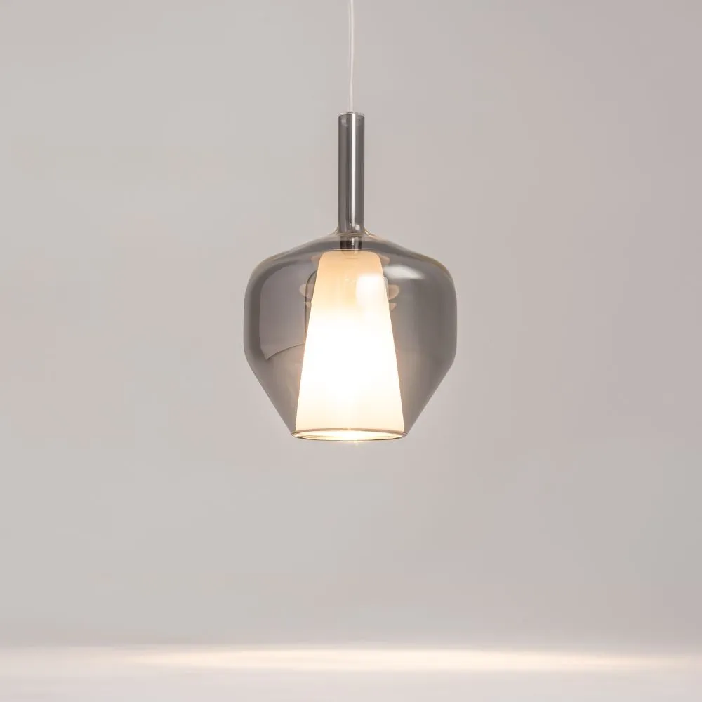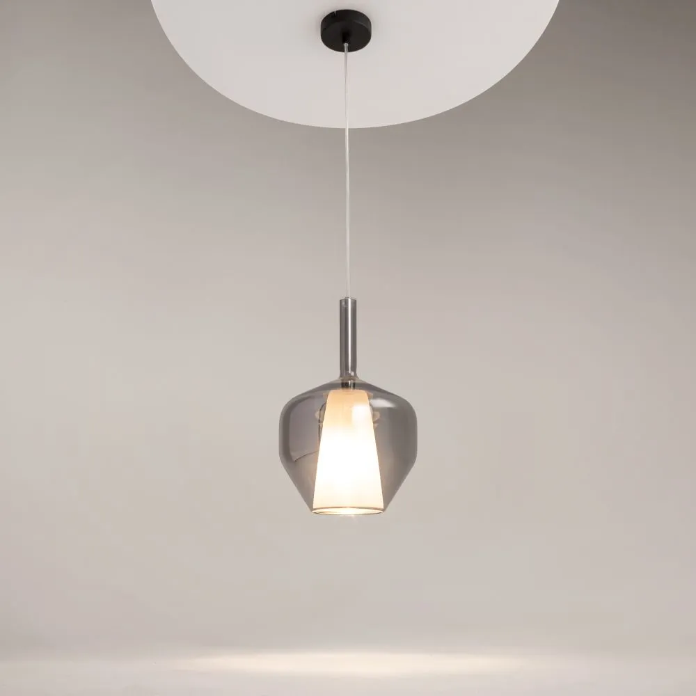 Металлическое основание, цвет — черный. Двойные стеклянные плафоны. Многообразные геометрические формы плафонов. Цвет стекла: зеркальный золотой, кофейный и дымчатый, а также градиентный белый. Регулируемая длина провода — 3 метра. Источник света — лампа с цоколем Е27.
