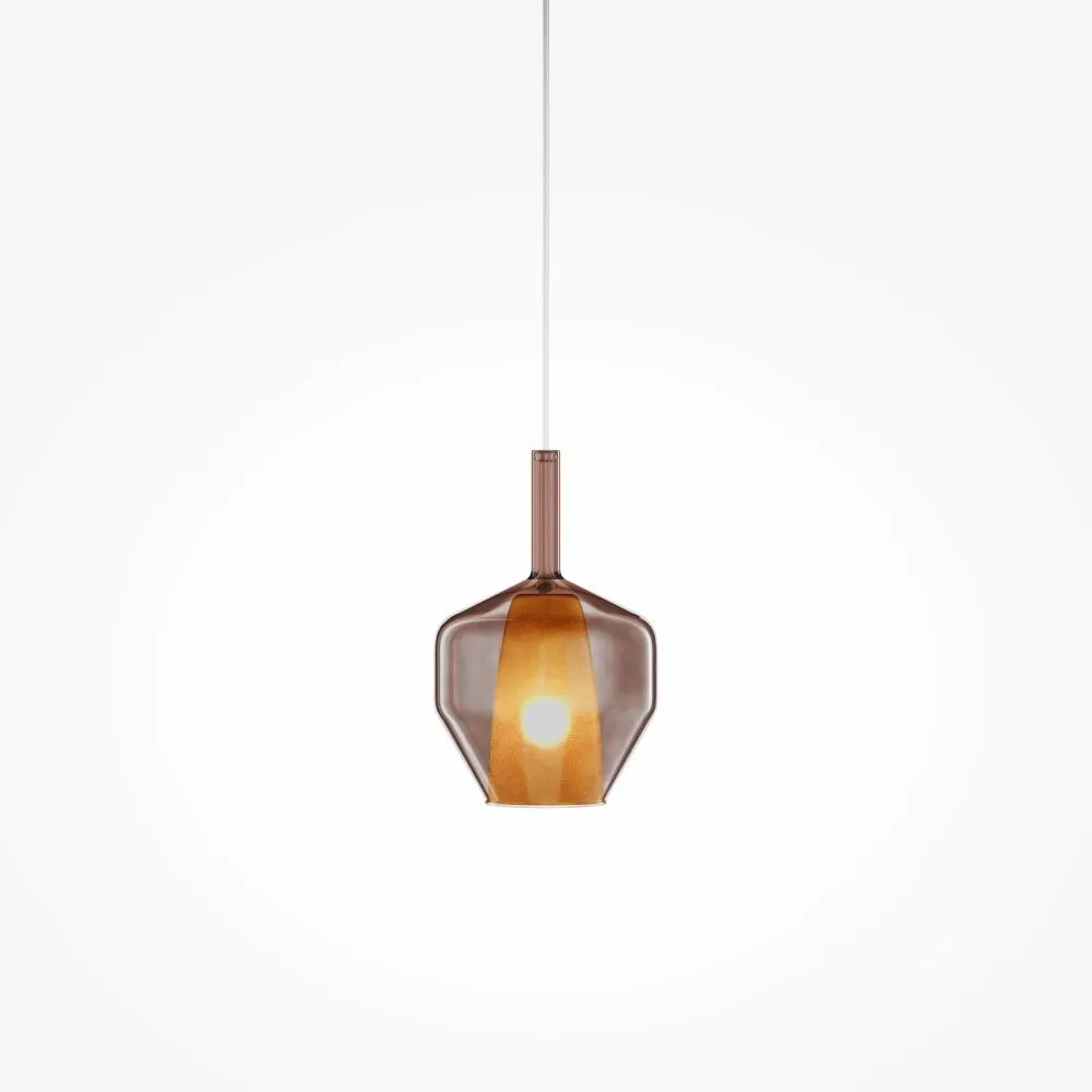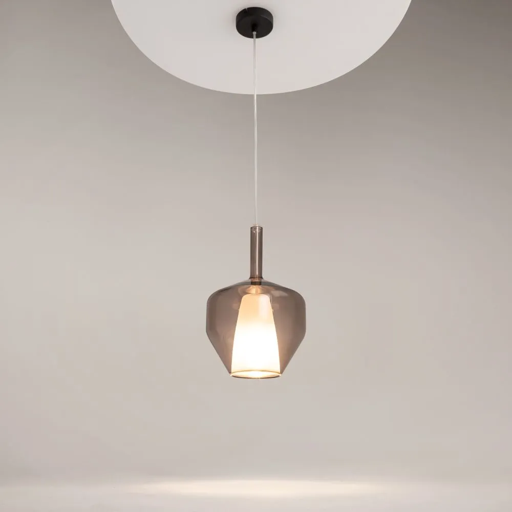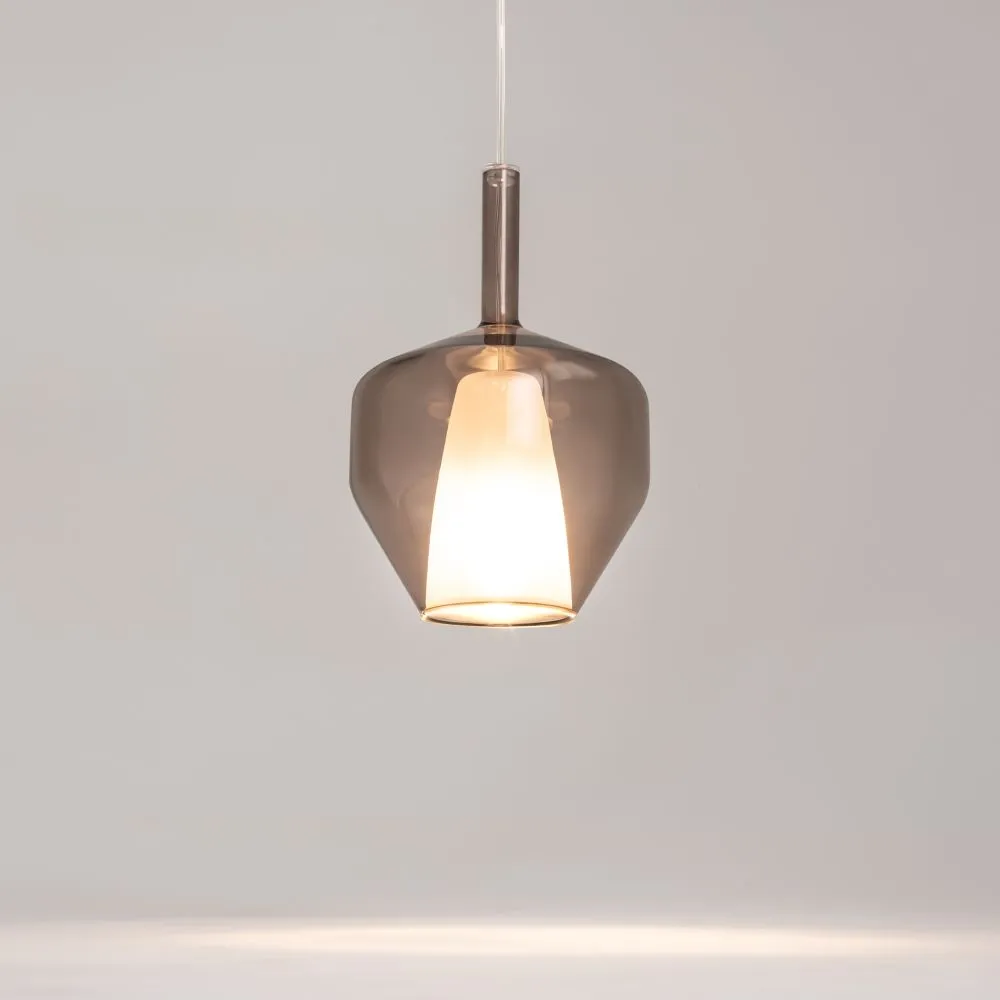 Металлическое основание, цвет — черный. Двойные стеклянные плафоны. Многообразные геометрические формы плафонов. Цвет стекла: зеркальный золотой, кофейный и дымчатый, а также градиентный белый. Регулируемая длина провода — 3 метра. Источник света — лампа с цоколем Е27.