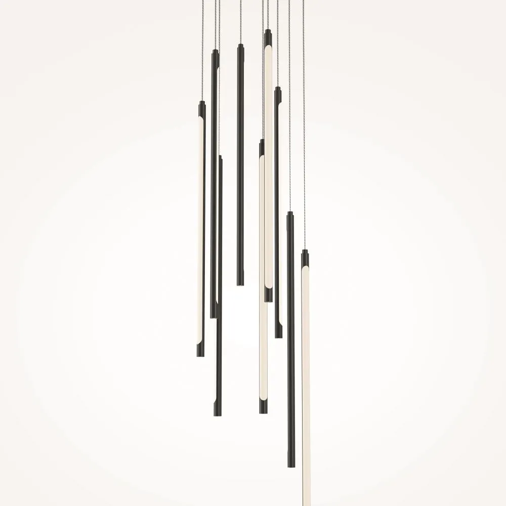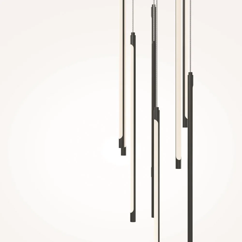 Материал арматуры - алюминий, цвет - черный, латунь. Изящные металлические «струны» в цвет арматуры со встроенным световым модулем прикрыты белым акриловым рассеивателем. Серия для акцентного и дополнительного освещения. Длина подвесных моделей регулируется. LED-источник света. У подвесных светильников есть функция диммирования. Цветовая температура 3000К.
