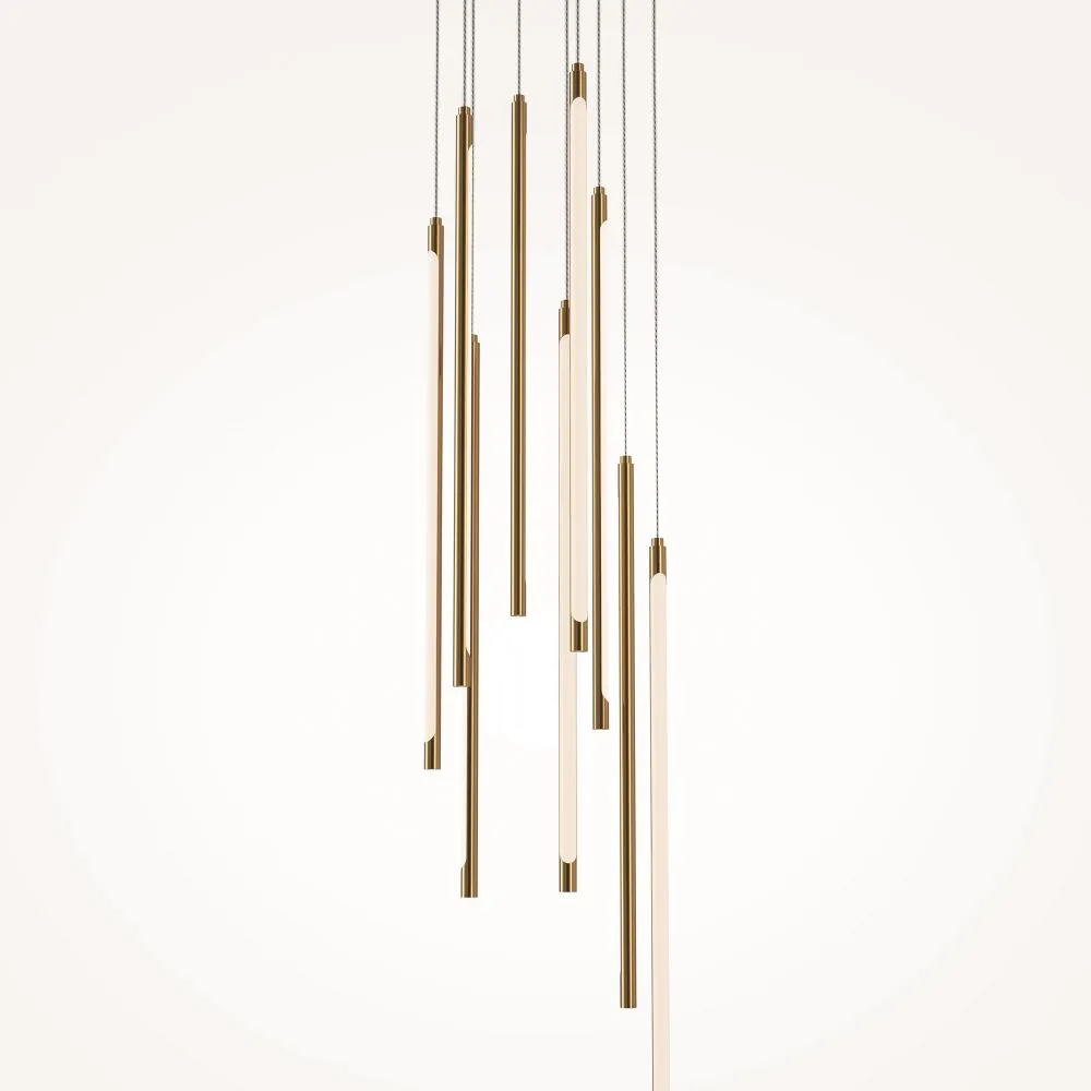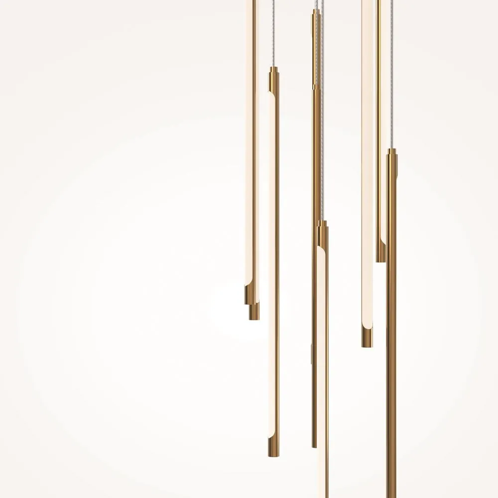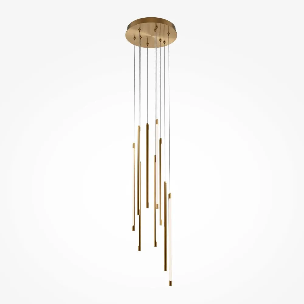 Материал арматуры - алюминий, цвет - черный, латунь. Изящные металлические «струны» в цвет арматуры со встроенным световым модулем прикрыты белым акриловым рассеивателем. Серия для акцентного и дополнительного освещения. Длина подвесных моделей регулируется. LED-источник света. У подвесных светильников есть функция диммирования. Цветовая температура 3000К.