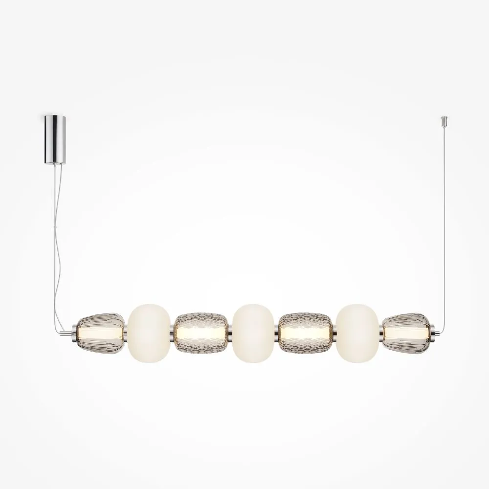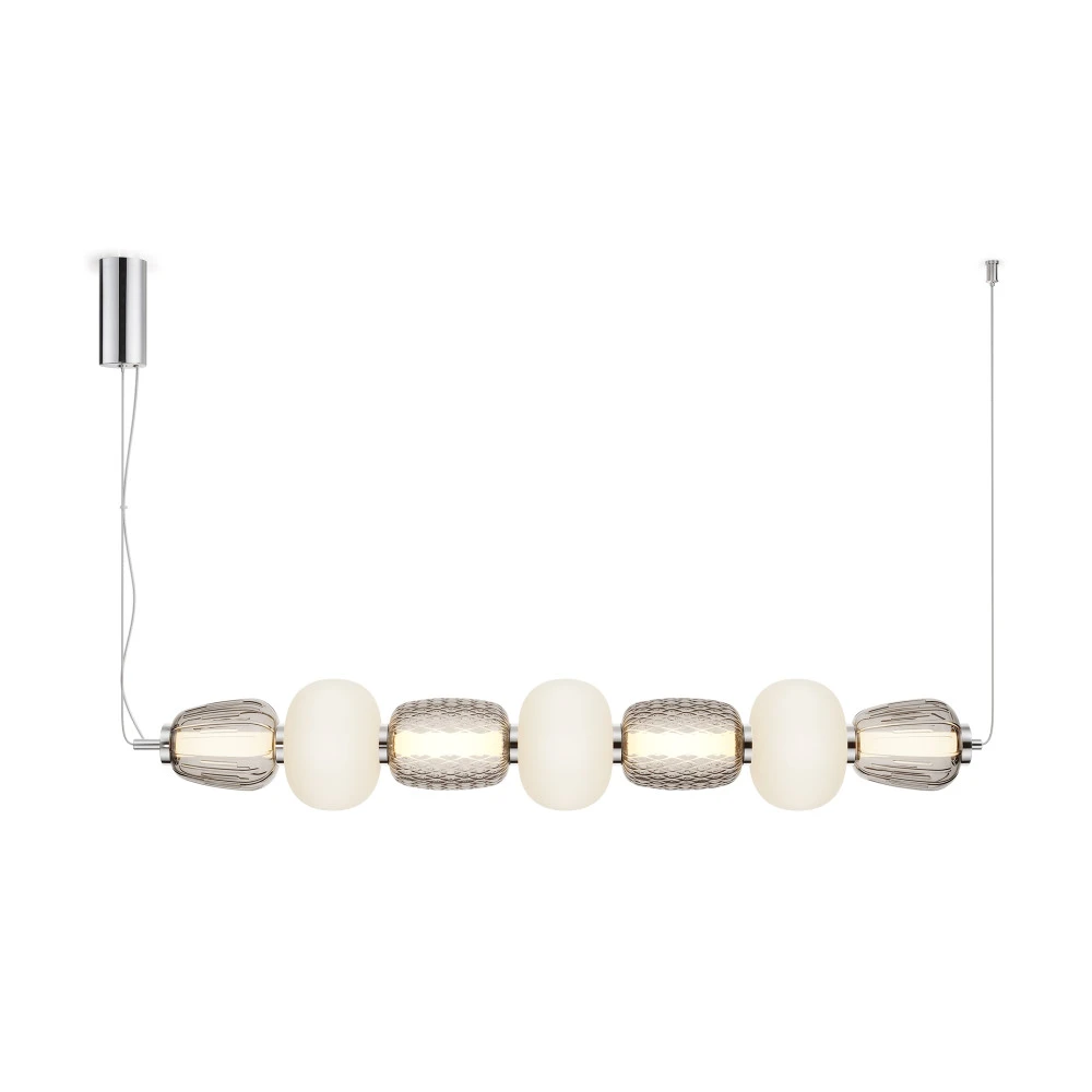 Металлическая арматура, цвет - золото, хром. Микс плафонов округлых и вытянутых форм из белого матового и прозрачного стекла с сетчатым и с линейным повторяющимся рельефным рисунком. Регулируемая высота подвесных моделей, провод - 3 метра. LED-источник света, цветовая температура 3000К.