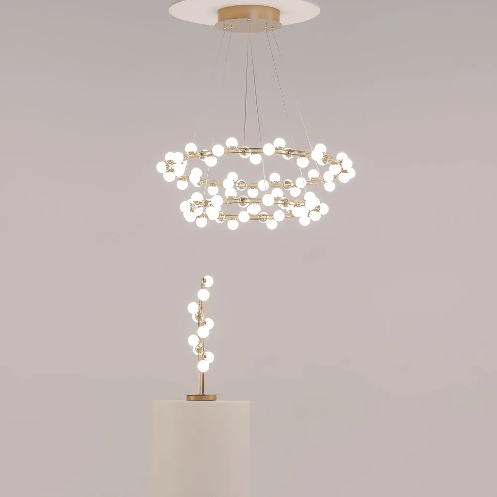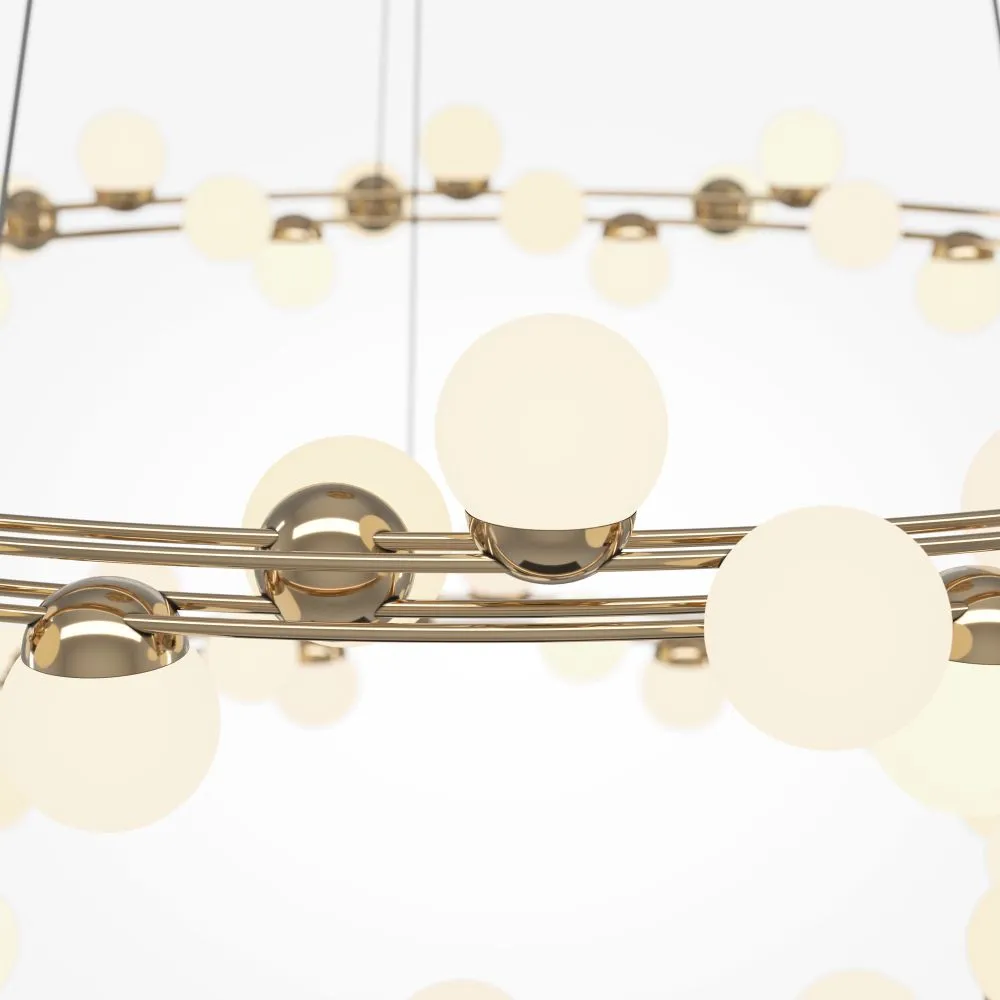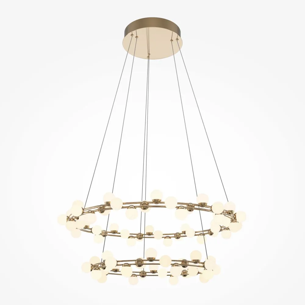 Арматура из металла в золотом цвете. Плафоны-сферы — белый пластик. Дизайн с имитацией молекулярной структуры. LED-источники света.