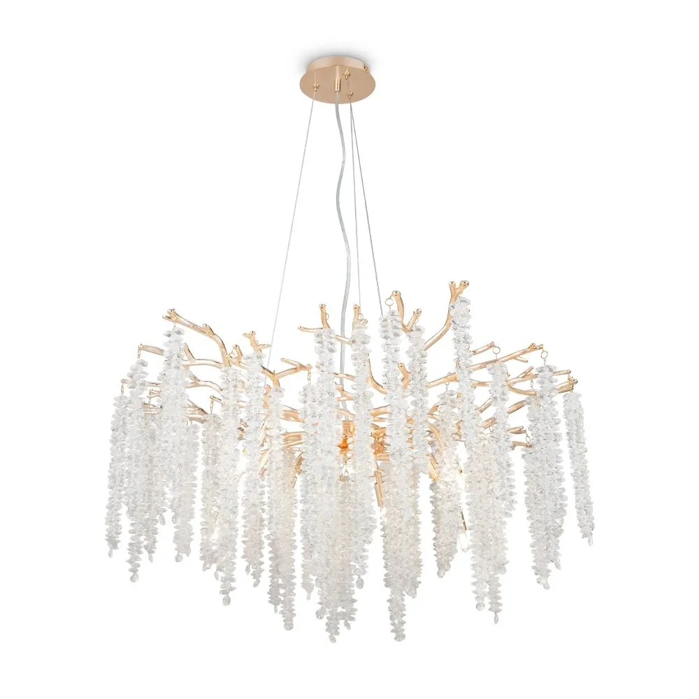 Материалы арматуры —металл, цвет — золото. Хрустальные декоративные элементы напоминают капельки - создают глубокие переливы света. Дизайн в трендовой растительной тематике. Источник света — лампа с цоколем G9 и с поворотной функцией.