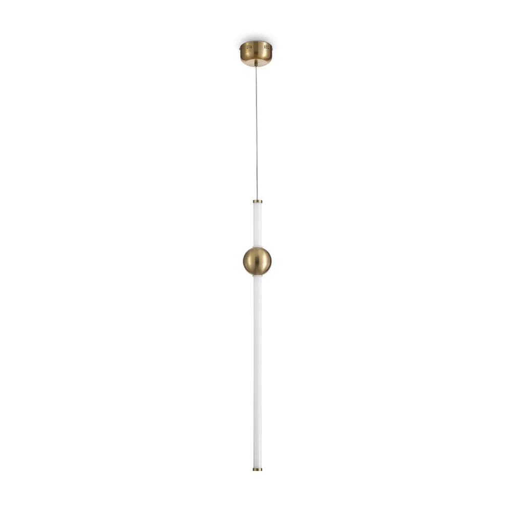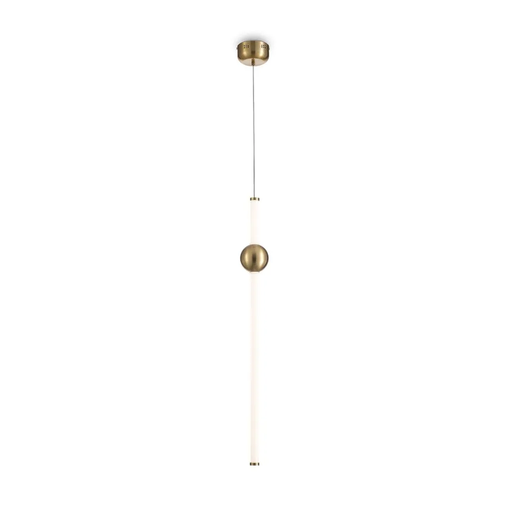 Арматура — тонкая металлическая, цвет — чёрный + латунь. Оригинальная конструкция. Три плафона-цилиндра с затемнённым стеклом закреплены на металлической оси cо встроенным LEDисточником света. Тренд «invisible light». Цветовая температура — 3000 К. Регулируемая высота.