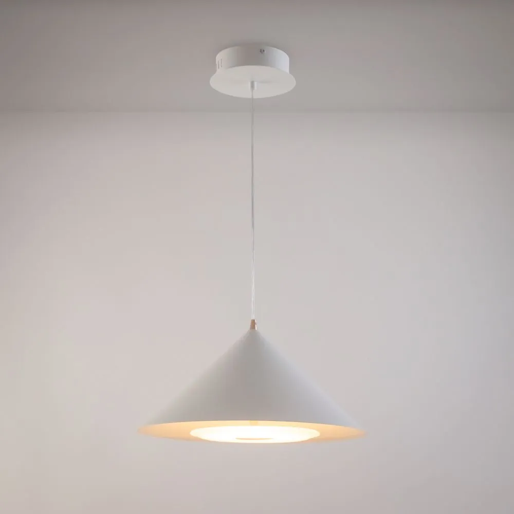 Металлическая арматура, цвета — чёрный и белый. Плафоны — конусовидные, среднего размера. Универсальный минималистичный дизайн, регулируемая высота. Светодиодный источник света. Цветовая температура — 3000К.