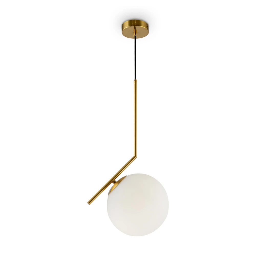 Новый ракурс и необычный угол зрения кардинально меняют представление о традиционных подвесах с плафонами-шарами. В этой серии металлическая арматура светильника изогнута под углом, ломанная линия создает яркий акцент, а сферическая форма плафона подчеркивает оригинальную геометрическую игру. Оттенок латуни и матовое стекло прекрасно дополняют друг друга. Популярный цветовой дуэт легко впишется в пространство современного интерьера. Благодаря наличию в серии светильников разного диаметра, есть возможность создать эффектную акцентную подсветку в помещении любых размеров.