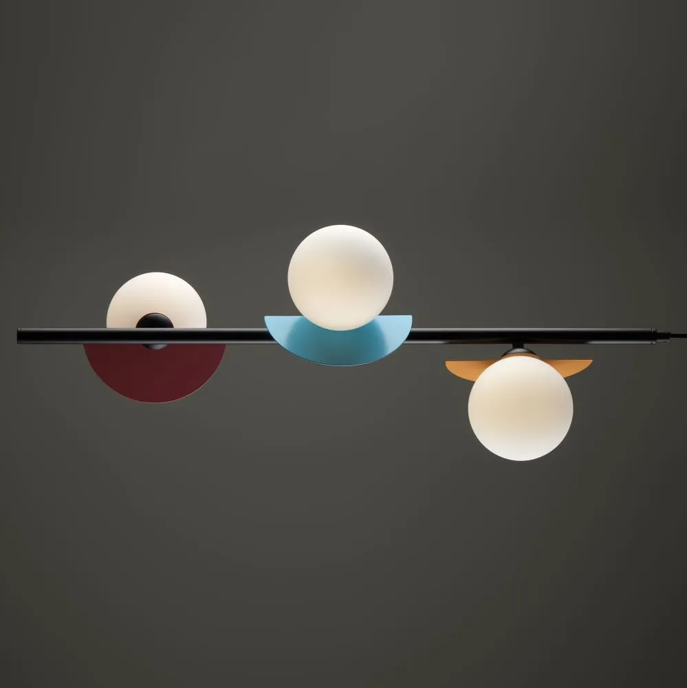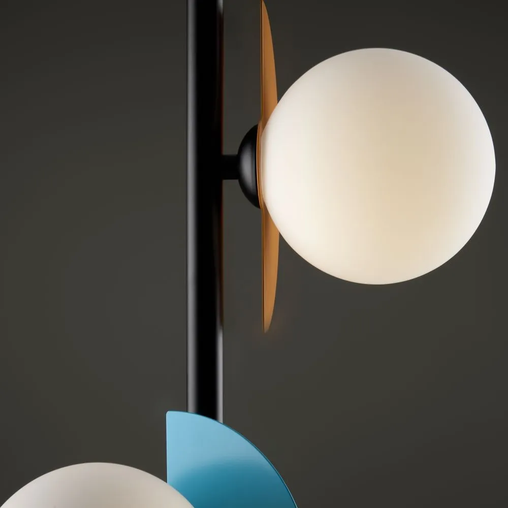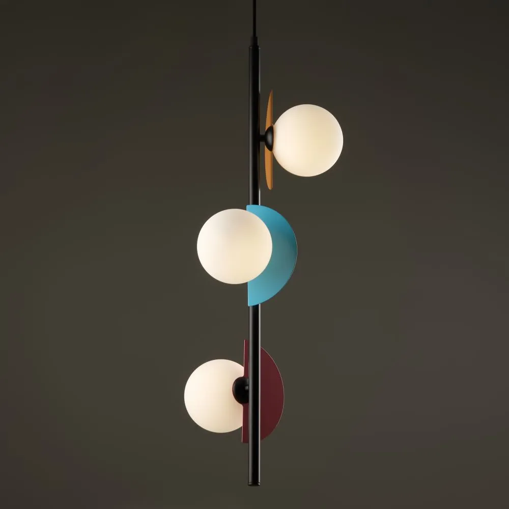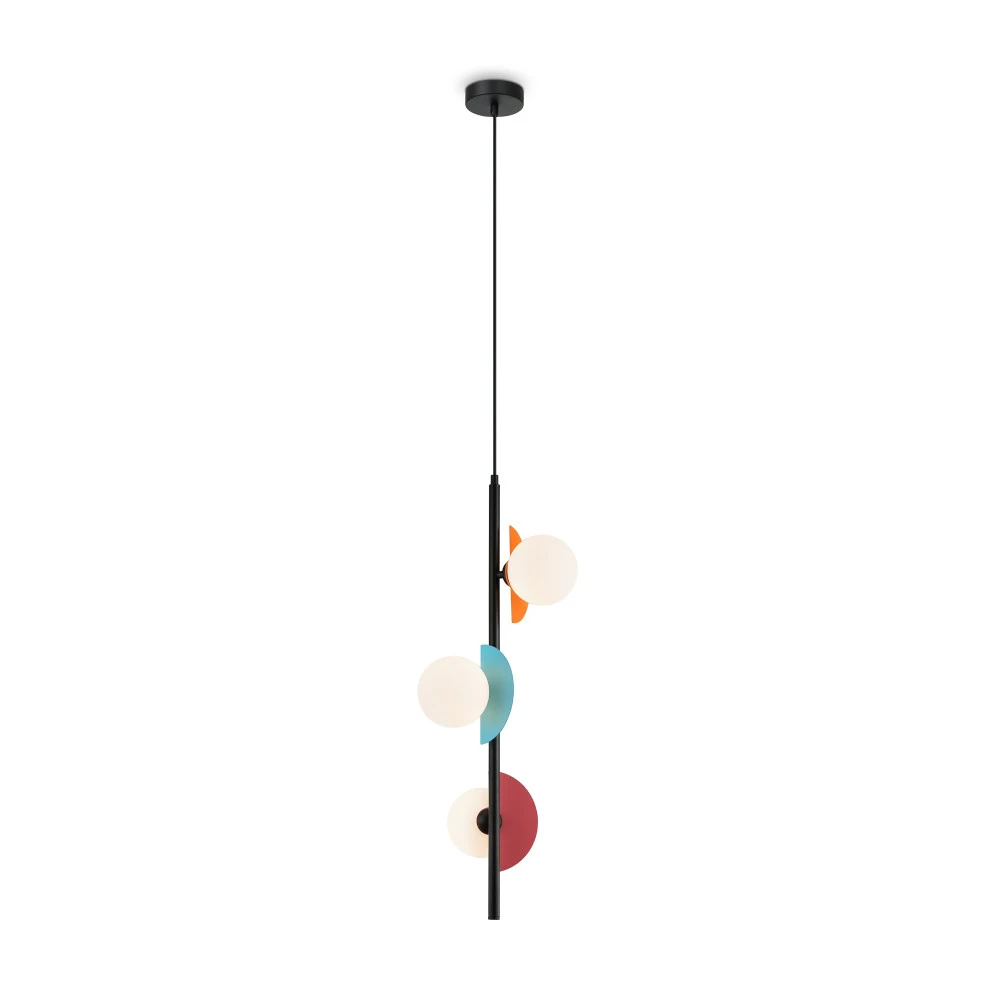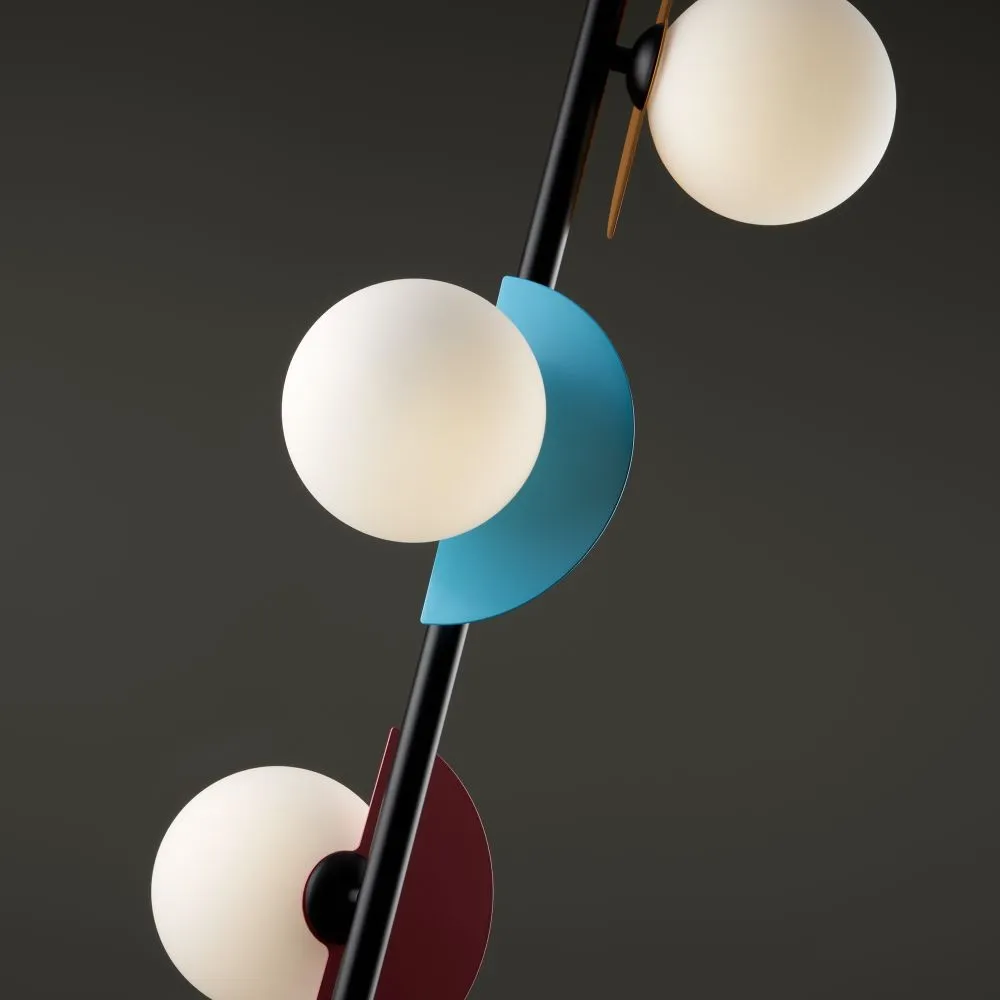 Арматура — металл, цвет — разноцветный или латунь. Белые матовые плафоны из стекла украшены металлическими золотыми или цветными лепестками. Динамичный дизайн для интерьеров в стиле Мемфис. Разнообразие форм в одной конструкции позволяет создать яркое освещение в больших комнатах. Высота регулируется. Источником света служит лампа с цоколем G9.