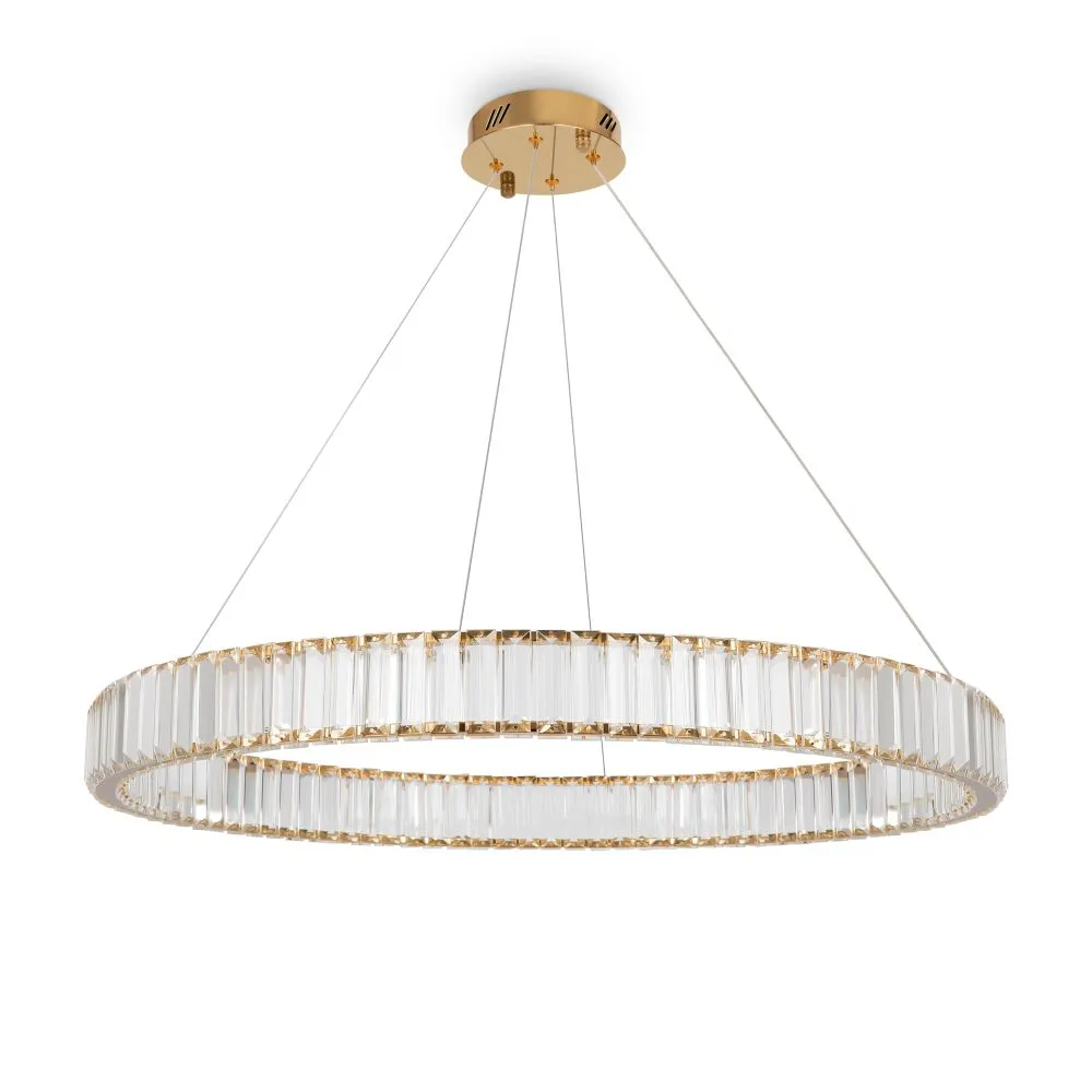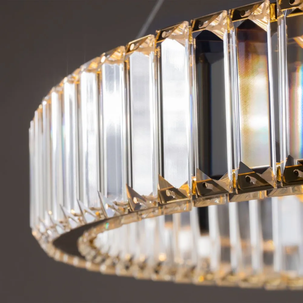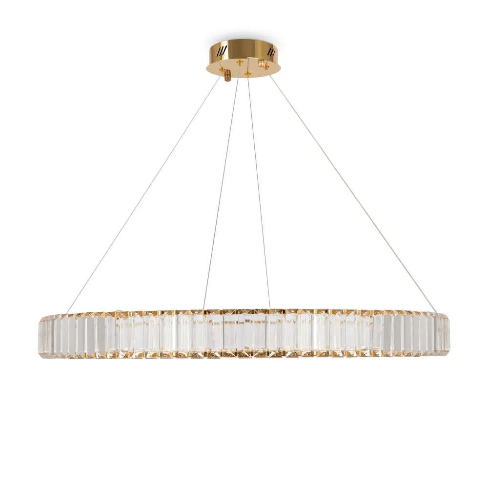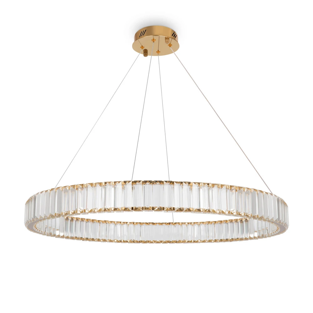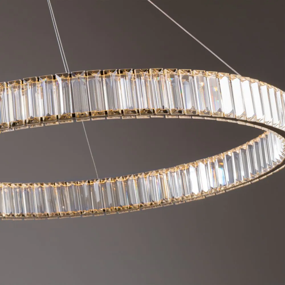 Металлическая арматура в цвете латунь и хром. Хрустальные декоративные кольца с геометричными гранями. LED-источник света. Регулировка цветовой температуры (3000-4000-5000K) и яркости 4G-dimming при помощи пульта (в комплекте).