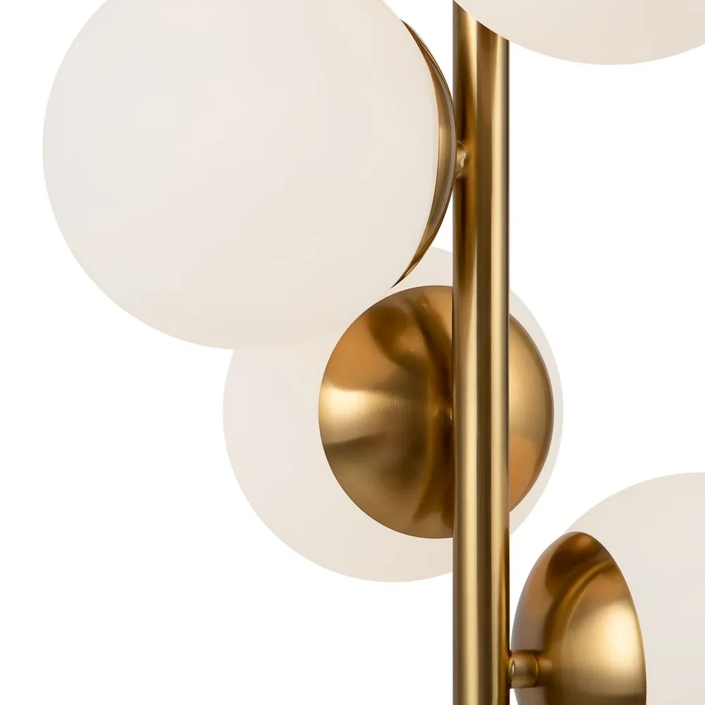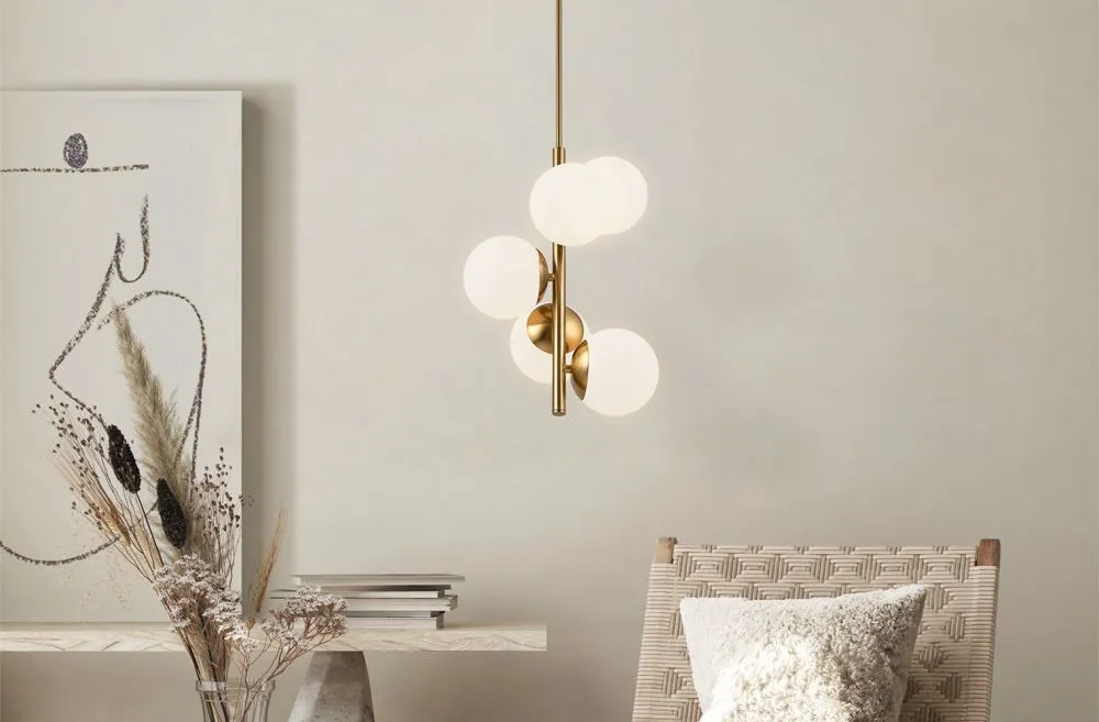 Металлическая арматура. Оттенок – латунь. Плафоны-сферы из матового стекла. Оригинальное конструктивное решение: плафоны размещены на горизонтальной или вертикальной планке. Источник света – лампа с цоколем Е27.