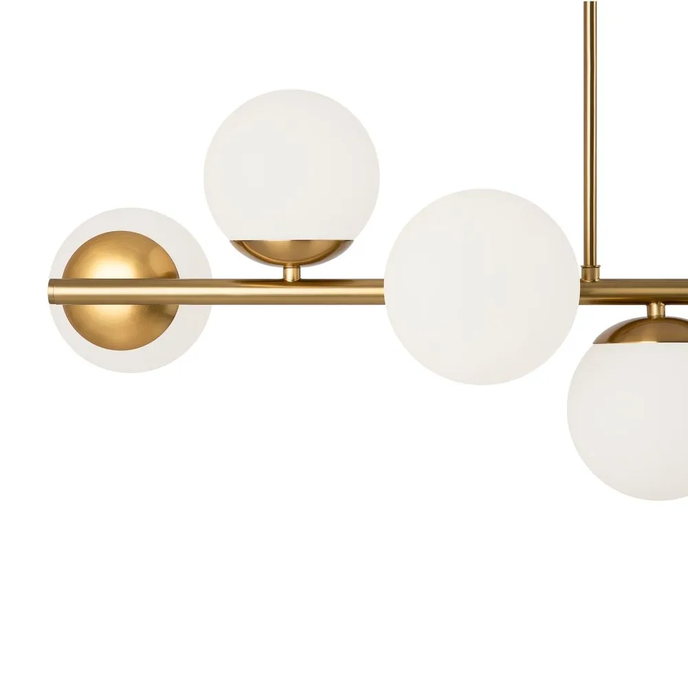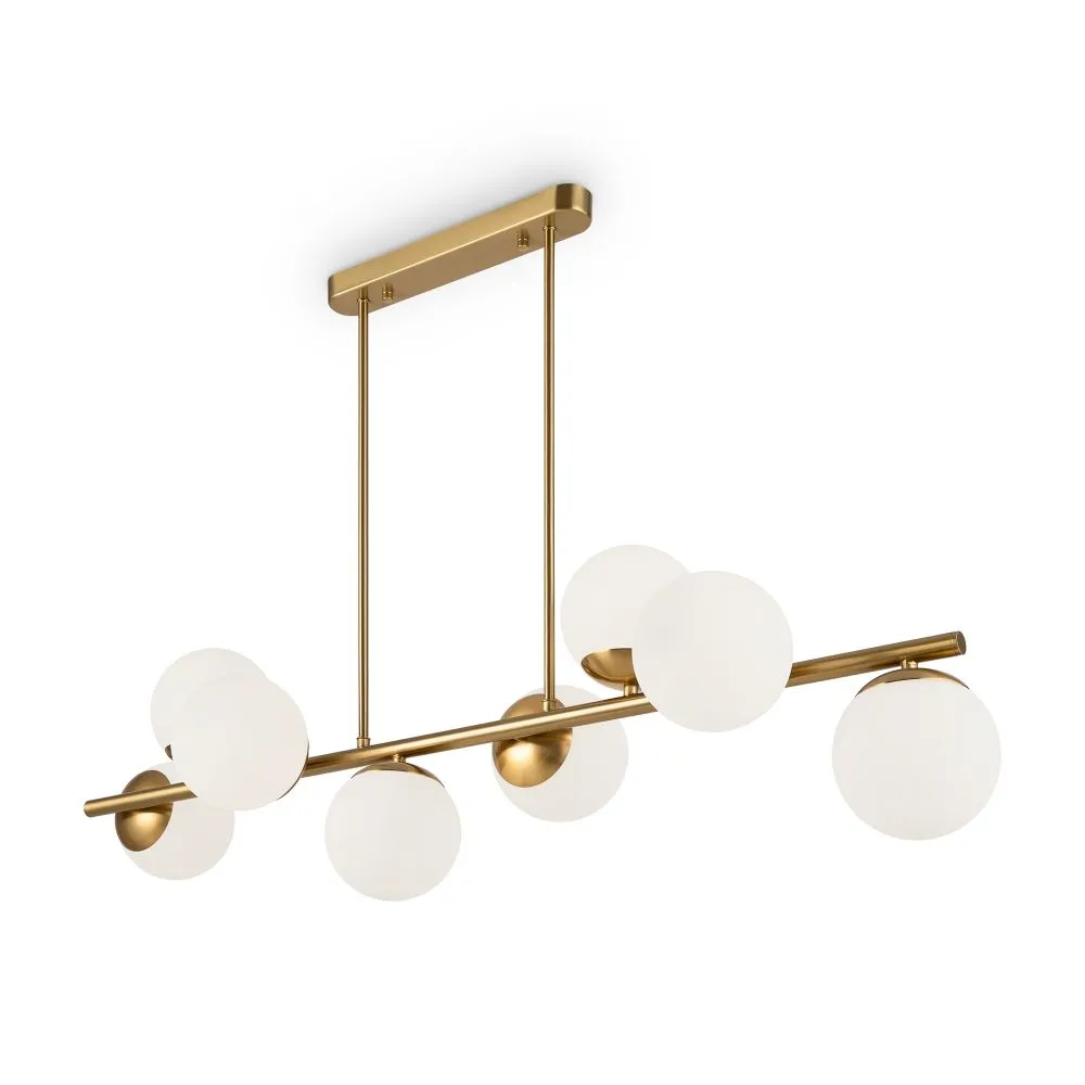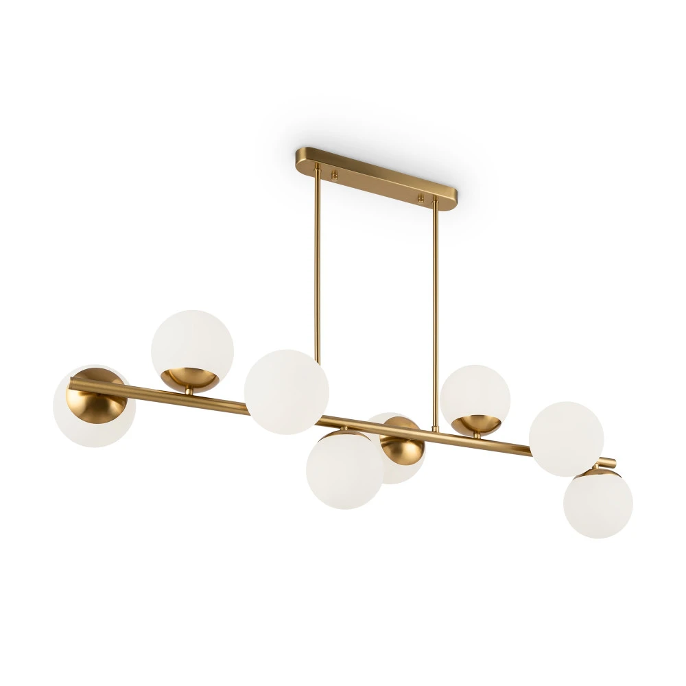 Металлическая арматура. Оттенок – латунь. Плафоны-сферы из матового стекла. Оригинальное конструктивное решение: плафоны размещены на горизонтальной или вертикальной планке. Источник света – лампа с цоколем Е27.