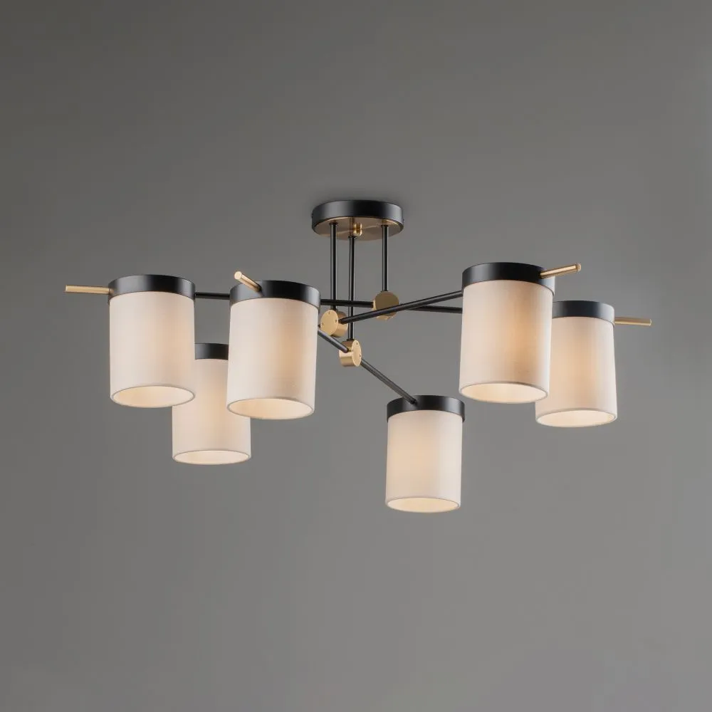 Арматура из металла. Основной цвет — чёрный, декоративные элементы в цвете латунь. Тканевые бежевые абажуры-цилиндры украшены чёрными металлическими основаниями. Компактные размеры для невысоких потолков. Источник света — лампа с цоколем Е14.