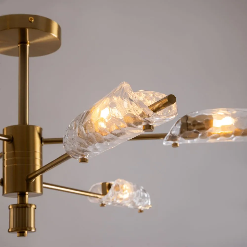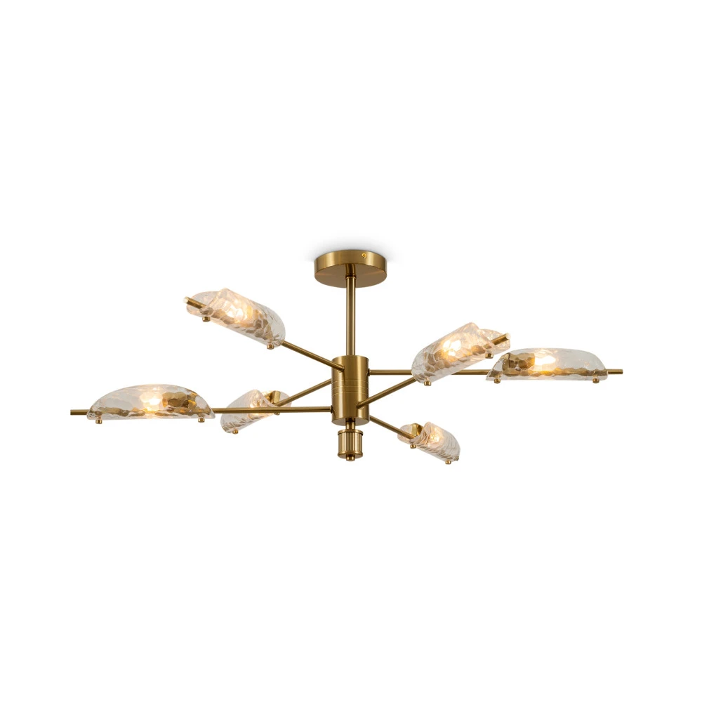 Металлический корпус, цвет— латунь. Плафон, моделированный под вытянутый лепесток с эффектом чеканки на стекле. Источник света — лампа с цоколем G9 и максимальной мощностью 30W дает яркое и равномерное освещение. Компактная высота – идеальное решение для низких потолков.
