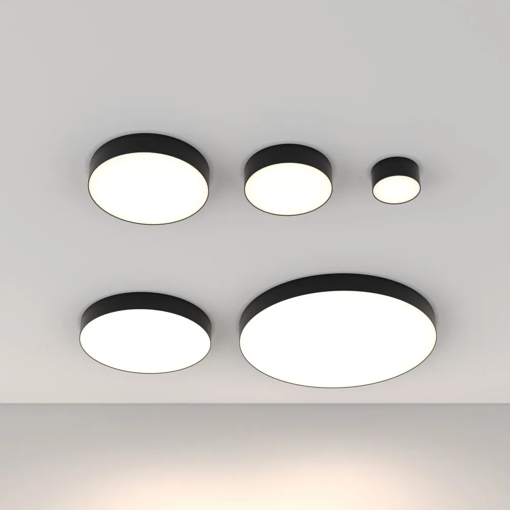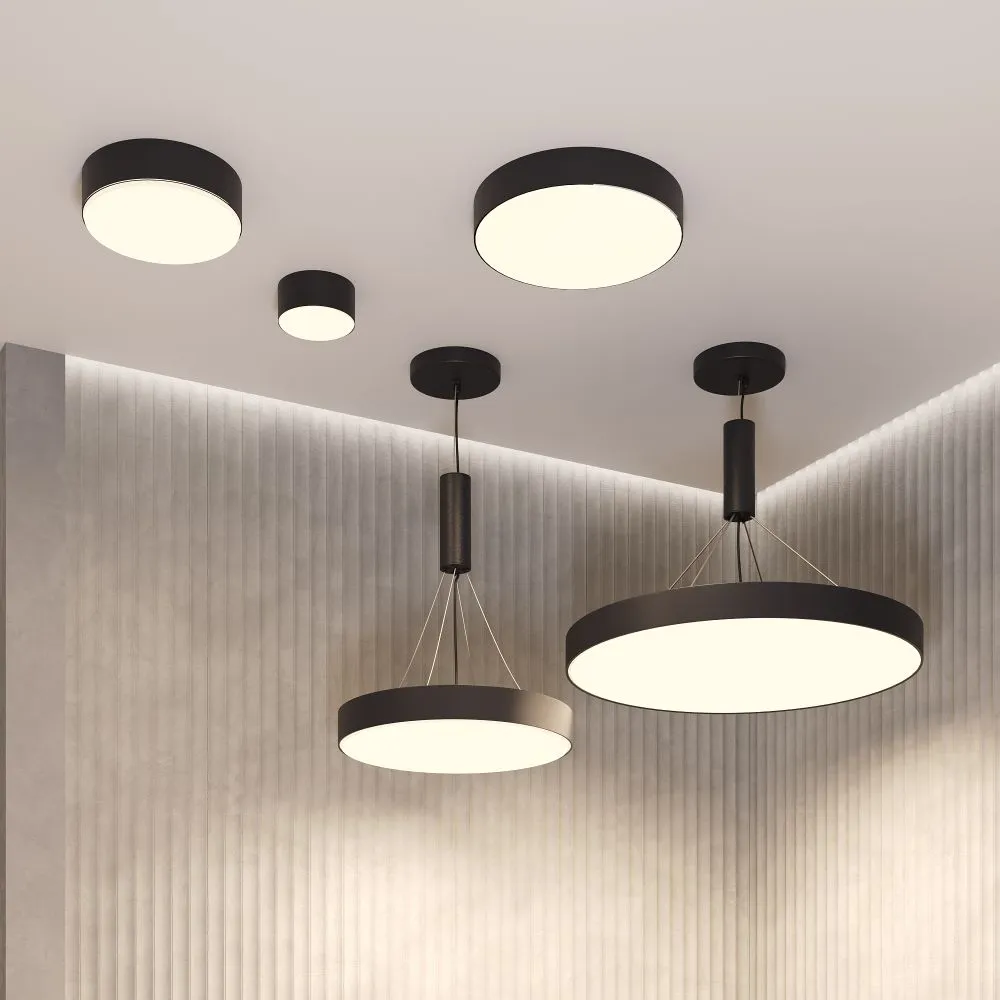 Материал корпуса – металл; цвета – чёрный, белый и золотой. Формы корпуса: круглая и квадратная. Типы монтажа: накладной, подвесной, а также трековые светильники. Подвесной монтаж универсален для обеих форм. Монтаж без видимых болтов. Варианты мощностей: 12W, 24W, 36W, 45W и 90W. LED-источник света. Цветовая температура – 3000 или 4000К. Высокий коэффициент цветопередачи. Совместимость с драйверами DALI и Triac для изменения цветовой температуры и диммирования. Аксессуар для монтажа круглых моделей в ГКЛ под шпаклёвку и универсальное крепление в ассортименте.