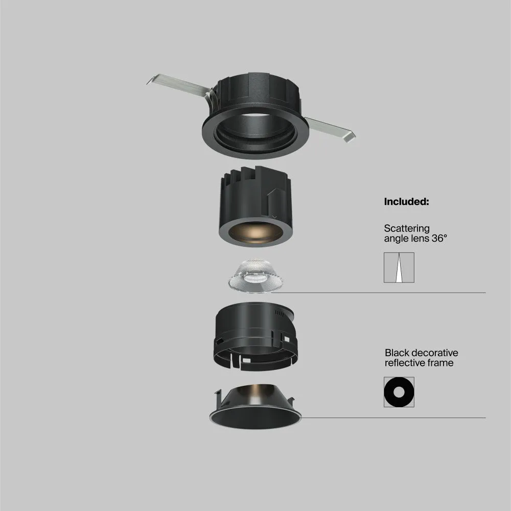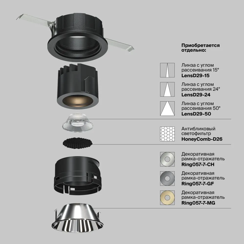 Встроенный утопленный источник света LED, обеспечивает мягкое рассеивание света. Поворотный механизм, позволит организовать акцентную подсветку зон и предметов интерьера. Сменные линзы и фильтры позволят изменить стандартный угол 36° на выбор от 15°-50° и сделать освещение более комфортным. Сменные рефлекторы в ассортименте, позволят подобрать цветовую гамму для большинства трендовых интерьеров.